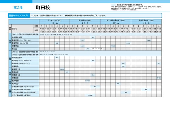 高2生町田校この色のマスが授業のある時限です。●同一名称の講座は設置校舎・設置期間(ターム)・授業時間(時限)が異なっても同一内容です。●担当講師は変更になる場合がありますので、あらかじめご了承ください。●講師のフルネームはWebサイトでご確認ください。豊富なラインアップ!オンライン授業の講座一覧は53ページ、映像授業の講座一覧は54ページをご覧ください。7/29(火)~8/2(土)1ターム431256128/4(月)~8/8(金)2ターム438/11(月・祝)~8/15(金)8/18(月)~8/22(金)56123ターム4356124ターム435609:0010:5013:2015:1017:0018:5009:0010:5013:2015:1017:0018:5009:0010:5013:2015:1017:0018:5009:0010:5013:2015:1017:0018:50〜〜〜〜〜〜〜〜〜〜〜〜〜10:3012:2014:5016:4018:3020:2010:3012:2014:5016:4018:3020:2010:3012:2014:5016:4018:3020:2010:3012:2014:5016:4018:3020:20〜〜〜〜〜〜〜〜〜〜〜7/20(日)15:20〜18:50伊藤(宏)8/23(土)15:20〜18:50近藤近藤7/26(土)15:20〜18:50生田8/9(土)15:20〜18:50隣8/16(土)15:20〜18:50依田生田伊藤(武)吉澤高木栗原大島栗原8/4〜8/6の3日間伊藤(宏)木村(麟)伊藤(直)香坂森永佐々木(哲)黒川佐々木(尊)依田窪田安達桐山隣酒井(完)森脇時限時間講座名教科【ダイジェスト】夏から始める入試対策英語(難関・標準)特別選抜英語難関英語-トップレベル-難関英語-ハイレベル-標準英語英文法【ダイジェスト】夏から始める入試対策数学(特別選抜・難関)【ダイジェスト】夏から始める入試対策数学(難関・標準)特別選抜数学難関数学-トップレベル-難関数学-ハイレベル-標準数学難関現代文難関古文標準現代文標準古文難関物理難関化学日本史集中講義(古代―近世)日本史集中講義(近現代)世界史集中講義(古代―18世紀)世界史集中講義(近現代)英語数学国語理科地歴