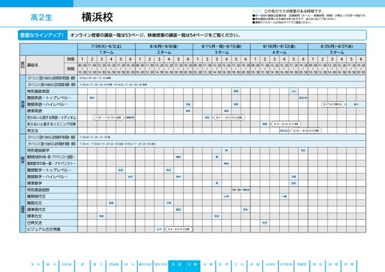 ●2025年度/夏期講習/東日本/藤沢/高2生/パターン34602025_56_3_331_32_20250328204503.csv/1ページ高2生横浜校校了時削除この色のマスが授業のある時限です。●同一名称の講座は設置校舎・設置期間(ターム)・授業時間(時限)が異なっても同一内容です。●担当講師は変更になる場合がありますので、あらかじめご了承ください。●講師のフルネームはWebサイトでご確認ください。7/29(火)~8/2(土)8/4(月)~8/8(金)8/11(月・祝)~8/15(金)8/18(月)~8/22(金)8/25(月)~8/27(水)1ターム431256122ターム4356123ターム4356124ターム4356125ターム435609:0011:0013:2015:2017:2019:2009:0011:0013:2015:2017:2019:2009:0011:0013:2015:2017:2019:2009:0011:0013:2015:2017:2019:2009:0011:0013:2015:2017:2019:20〜〜〜〜〜〜〜〜〜〜〜〜〜〜〜〜〜〜〜〜〜〜〜〜10:3012:3014:5016:5018:5020:5010:3012:3014:5016:5018:5020:5010:3012:3014:5016:5018:5020:5010:3012:3014:5016:5018:5020:5010:3012:3014:5016:5018:5020:50〜〜〜〜〜〜8/9(土)09:00〜12:30新野7/26(土)17:20〜20:50仲野8/16(土)17:20〜20:50幸長押田7/29〜7/31の3日間髙橋(保)7/20(日)13:20〜16:50隣7/29(火)19:20〜20:50依田8/9(土)17:20〜20:50板谷2・7/30()19:20~20:0依田8/9(土17:0~0:50板谷依田生田渡部佐々木(哲)隼坂岡島柏川越南浦和大宮岡島金沢文庫あざみ野天倉幸長新野仲野栗原清川8/11〜8/13の3日間小山柴田(卓)8/27は5限のみ香川青柳8/21・8/22の2日間内山(九)8/18〜8/20の3日間瀬谷岩村板谷大野飯田山下8/4・8/5の2日間杉山隣横田小林隣堺和田手塚・税田・髙橋(佳)森永佐河岩村吉崎岩村一瀬小竹浅利杉山横浜藤沢厚木町田立川調布吉祥寺自由が丘秋葉原池袋新宿麹町時限時間講座名教科【ダイジェスト】夏から始める入試対策英語(特別選抜・難関)【ダイジェスト】夏から始める入試対策英語(難関・標準)特別選抜英語難関英語-トップレベル-難関英語-ハイレベル-標準英語知らないと損する熟語・イディオム知らないと損するリスニング対策英文法【ダイジェスト】夏から始める入試対策数学(特別選抜・難関)【ダイジェスト】夏から始める入試対策数学(難関・標準)特別選抜数学難関理系数学中高一貫-アドバンスト(速習)-難関数学中高一貫-アドバンスト-難関数学-トップレベル-難関数学-ハイレベル-標準数学特別選抜国語難関現代文難関古文標準現代文標準古文古典文法ビジュアル古文常識特別選抜物理難関物理特別選抜化学難関化学物理基礎の徹底理解化学基礎の徹底理解千葉水戸津田沼英語数学国語理科豊富なラインアップ!オンライン授業の講座一覧は53ページ、映像授業の講座一覧は54ページをご覧ください。