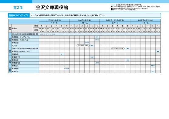 高2生金沢文庫現役館この色のマスが授業のある時限です。●同一名称の講座は設置校舎・設置期間(ターム)・授業時間(時限)が異なっても同一内容です。●担当講師は変更になる場合がありますので、あらかじめご了承ください。●講師のフルネームはWebサイトでご確認ください。豊富なラインアップ!オンライン授業の講座一覧は53ページ、映像授業の講座一覧は54ページをご覧ください。7/29(火)~8/2(土)1ターム431256128/4(月)~8/8(金)2ターム438/11(月・祝)~8/15(金)8/18(月)~8/22(金)56123ターム4356124ターム435609:0010:5013:2015:1017:0018:5009:0010:5013:2015:1017:0018:5009:0010:5013:2015:1017:0018:5009:0010:5013:2015:1017:0018:50〜〜〜〜〜〜〜〜〜〜〜〜〜10:3012:2014:5016:4018:3020:2010:3012:2014:5016:4018:3020:2010:3012:2014:5016:4018:3020:2010:3012:2014:5016:4018:3020:20〜〜〜〜〜〜〜〜〜〜〜8/3(日)13:20〜16:40田村(修)安井伊藤(宏)田村(修)8/4〜8/6の3日間安井小池鹿子島堺佐々木(哲)8/11・8/12の2日間横田和田横田阿部(順)原講座名時限時間【ダイジェスト】夏から始める入試対策英語(難関・標準)難関英語-トップレベル-難関英語-ハイレベル-標準英語英文法【ダイジェスト】夏から始める入試対策数学(難関・標準)難関数学-ハイレベル-標準数学難関現代文難関古文標準現代文標準古文難関物理難関化学教科英語数学国語理科