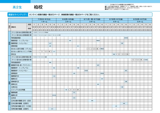 高2生柏校この色のマスが授業のある時限です。●同一名称の講座は設置校舎・設置期間(ターム)・授業時間(時限)が異なっても同一内容です。●担当講師は変更になる場合がありますので、あらかじめご了承ください。●講師のフルネームはWebサイトでご確認ください。豊富なラインアップ!オンライン授業の講座一覧は53ページ、映像授業の講座一覧は54ページをご覧ください。7/29(火)~8/2(土)8/4(月)~8/8(金)8/11(月・祝)~8/15(金)8/18(月)~8/22(金)8/25(月)~8/27(水)1ターム431256122ターム4356123ターム4356124ターム4356125ターム435609:0010:5013:2015:1017:0018:5009:0010:5013:2015:1017:0018:5009:0010:5013:2015:1017:0018:5009:0010:5013:2015:1017:0018:5009:0010:5013:2015:1017:0018:50〜〜〜〜〜〜〜〜〜〜〜〜〜〜〜〜〜〜〜〜〜〜〜〜〜〜〜〜〜〜10:3012:2014:5016:4018:3020:2010:3012:2014:5016:4018:3020:2010:3012:2014:5016:4018:3020:2010:3012:2014:5016:4018:3020:2010:3012:2014:5016:4018:3020:207/28(月)17:00〜20:20伊藤(直)7/24(木)17:00〜20:20山川8/9(土)17:00〜20:20仲野山川岩間7/29・7/30の2日間山川7/20(日)17:00〜20:20遠藤是枝伊藤(直)成川8/11〜8/13の3日間伊藤(直)田村(喜)仲野岩舩8/20〜8/22の3日間8/25・8/26の2日間中村(隆)飯島福永小池鈴木(翔)永井遠藤永島中村(隆)成合隼坂伊東(鋼)佐河島田松藤川崎今西8/4・8/5の2日間竹中大内髙橋舩倉大野時限時間講座名教科【ダイジェスト】夏から始める入試対策英語(特別選抜・難関)【ダイジェスト】夏から始める入試対策英語(難関・標準)特別選抜英語難関英語-トップレベル-難関英語-ハイレベル-標準英語知らないと損する熟語・イディオム知らないと損するリスニング対策英文法【ダイジェスト】夏から始める入試対策数学(特別選抜・難関)【ダイジェスト】夏から始める入試対策数学(難関・標準)特別選抜数学難関数学中高一貫-アドバンスト-難関数学-トップレベル-難関数学-ハイレベル-標準数学難関現代文難関古文標準現代文標準古文古典文法ビジュアル古文常識難関物理難関化学日本史日本史集中講義(古代―近世)日本史集中講義(近現代)世界史集中講義(古代―18世紀)世界史集中講義(近現代)英語数学国語理科地歴