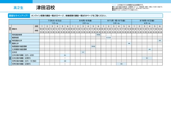 津田沼校木下伊東(鋼)宮本天野島田飯島天野この色のマスが授業のある時限です。天野●同一名称の講座は設置校舎・設置期間(ターム)・授業時間(時限)が異なっても同一内容です。●担当講師は変更になる場合がありますので、あらかじめご了承ください。●講師のフルネームはWebサイトでご確認ください。柳沢豊富なラインアップ!オンライン授業の講座一覧は53ページ、映像授業の講座一覧は54ページをご覧ください。手塚・中西・酒井(辰)小宮時限高2生特別選抜数学難関理系数学中高一貫-アドバンスト(速習)-難関数学-トップレベル-難関数学-ハイレベル-標準数学特別選抜国語難関現代文難関古文標準現代文標準古文古典文法ビジュアル古文常識日本史抜物理日本史集中講義(古代―近世)特別選抜化学義(近現代)難関化学中講義(古代―18世紀)時限世界史集中講義(近現代)化学基礎の徹底理解日本史日本史集中講義(古代―近世)日本史集中講義(近現代)世界史集中講義(古代―18世紀)世界史集中講義(近現代)時間時間数学国語教科地歴科教科地歴7/29(火)~8/2(土)1ターム431256128/4(月)~8/8(金)2ターム43阿部(順)8/11(月・祝)~8/15(金)5612松藤3ターム4356128/18(月)~8/22(金)野4ターム43中林6509:0010:50〜〜10:3012:2013:20〜平賀145015:1017:0018:5009:0010:5013:2015:1017:00〜〜〜〜〜〜〜〜16:4018:3020:2010:3012:2014:5016:4018:3018:50川崎〜20:2009:0010:5013:2015:1017:0018:5009:0010:5013:2015:1017:0018:50〜〜〜〜〜〜〜〜〜〜〜〜10:3012:2014:5016:4018:3020:2010:3012:2014:5016:4018:3020:207/29(火)~8/2(土)高杉121ターム345島崎6128/4(月)~8/8(金)2ターム34佐々木(哲)8/11(月・祝)~8/15(金)8/18(月)~8/22(金)56123ターム345安東612高杉4ターム34浅利65大内中野(健)09:0010:5013:2015:1017:0018:5009:0010:5013:2015:1017:00野(18:5009:0010:5013:2015:10髙岡17:0018:5009:0010:5013:20〜〜〜〜〜〜〜〜〜〜〜〜〜〜〜〜〜〜〜〜〜10:3012:2014:5016:4018:3020:2010:3012:2014:5016:4018:3020:2010:3012:2014:5016:4018:3020:2010:3012:2014:5015:10〜浅利16:4017:0018:50〜〜18:3020:20高杉大内●2025年度/夏期講習/東日本/津田沼/高2生/パターン3460島崎2025_56_3_327_32_20250328105211.csv/1ページ校了時削除高杉髙岡