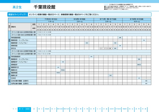 ●2025年度/夏期講習/東日本/津田沼/高2生/パターン34602025_56_3_327_32_20250328105211.csv/2ページ校了時削除この色のマスが授業のある時限です。●同一名称の講座は設置校舎・設置期間(ターム)・授業時間(時限)が異なっても同一内容です。●担当講師は変更になる場合がありますので、あらかじめご了承ください。●講師のフルネームはWebサイトでご確認ください。高2生千葉現役館121ターム4356122ターム4356123ターム4356124ターム435609:0010:5013:2015:1017:0018:5009:0010:5013:2015:1017:0018:5009:0010:5013:2015:1017:0018:5009:0010:5013:2015:1017:0018:50〜〜〜〜〜〜〜〜〜〜〜〜〜10:3012:2014:5016:4018:3020:2010:3012:2014:5016:4018:3020:2010:3012:2014:5016:4018:3020:2010:3012:2014:5016:4018:3020:20〜〜〜〜〜〜〜〜〜〜〜8/10(日)13:20〜16:40石橋7/26(土)17:00〜20:20日髙7/20(日)13:20〜16:40飯島8/9(土)17:00〜20:20天野天野阿部(誠)小宮中野(健)石橋是枝8/11〜8/13の3日間藤田加藤日髙福永安東平林飯島高梨(由)大内髙橋髙岡時限時間講座名教科【ダイジェスト】夏から始める入試対策英語(特別選抜・難関)【ダイジェスト】夏から始める入試対策英語(難関・標準)特別選抜英語難関英語-トップレベル-難関英語-ハイレベル-標準英語英文法【ダイジェスト】夏から始める入試対策数学(特別選抜・難関)【ダイジェスト】夏から始める入試対策数学(難関・標準)特別選抜数学難関数学-トップレベル-難関数学-ハイレベル-標準数学難関現代文難関古文難関物理難関化学日本史日本史集中講義(近現代)世界史集中講義(近現代)英語数学国語理科地歴豊富なラインアップ!オンライン授業の講座一覧は53ページ、映像授業の講座一覧は54ページをご覧ください。●2025年度/夏期講習/東日本/津田沼/高2生/パターン34607/29(火)~8/2(土)2025_56_3_327_32_20250328105211.csv/2ページ8/11(月・祝)~8/15(金)8/4(月)~8/8(金)校了時削除8/18(月)~8/22(金)水戸千葉津田沼柏川越南浦和大宮金沢文庫あざみ野横浜藤沢厚木町田立川調布吉祥寺自由が丘秋葉原池袋新宿麹町
