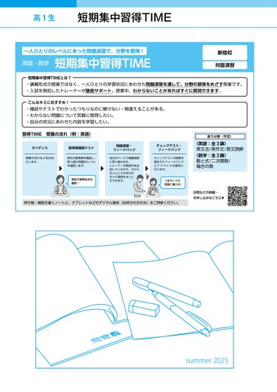 高1生短期集中習得TIME一人ひとりのレベルにあった問題演習で、分野を習得!英語・数学短期集中習得TIME新宿校対面演習短期集中習得TIMEとは?・講義形式の授業ではなく、一人ひとりの学習状況にあわせた問題演習を通して、分野の習得をめざす授業です。・入試を熟知したトレーナーが徹底サポート。授業中、わからないことがあればすぐに質問できます。こんなキミにおすすめ!・模試やテストでわかったつもりなのに解けない・間違えることがある。・わからない問題について気軽に質問したい。・自分の状況にあわせた内容を学習したい。習得TIME受講の流れ(例:英語)ガイダンス習得度確認テスト授業の流れなどをお伝えします。単元の習得度を確認し、取り組む問題のレベルを確認します。現在の習得状況を確認!問題演習・フィードバック自分のペースで問題演習に取り組みます。トレーナーが教室内を巡回しているので、わからないところがあればすぐに質問することができます。チェックテスト・フィードバックチェックテストの結果を踏まえたフィードバックとアドバイスを個別に行います。つまずいても気軽に聞ける!扱う分野(予定)〈英語:全3講〉英文法/英作文/長文読解〈数学:全3講〉数と式/二次関数/場合の数持ち物:解答を書くノートと、タブレットなどのデジタル端末(お持ちの方のみ)をご持参ください。日程などの詳細・お申し込みはこちら▶summer2025