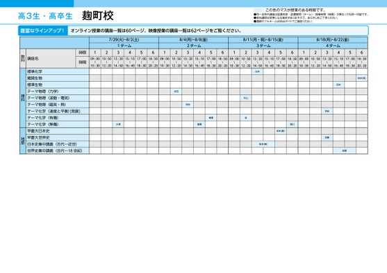 高3生・高卒生麹町校この色のマスが授業のある時限です。●同一名称の講座は設置校舎・設置期間(ターム)・授業時間(時限)が異なっても同一内容です。●担当講師は変更になる場合がありますので、あらかじめご了承ください。●講師のフルネームはWebサイトでご確認ください。豊富なラインアップ!オンライン授業の講座一覧は60ページ、映像授業の講座一覧は62ページをご覧ください。7/29(火)~8/2(土)1ターム341256128/4(月)~8/8(金)2ターム348/11(月・祝)~8/15(金)8/18(月)~8/22(金)56123ターム3456124ターム345609:0010:5013:2015:1017:0018:5009:0010:5013:2015:1017:0018:5009:0010:5013:2015:1017:0018:5009:0010:5013:2015:1017:0018:50〜〜〜〜〜〜〜〜〜〜〜〜〜10:3012:2014:5016:4018:3020:2010:3012:2014:5016:4018:3020:2010:3012:2014:5016:4018:3020:2010:3012:2014:5016:4018:3020:20〜〜〜〜〜〜〜〜〜〜〜合田合田大澤樹葉樹葉臼井杉山金菊川坂本(勝)坂本(勝)向井(亮)田中寺田加藤加藤時限時間講座名教科標準化学難関生物標準生物テーマ物理(力学)テーマ物理(波動・電気)テーマ物理(磁気・熱)テーマ化学(速度と平衡)[発展]テーマ化学(有機)テーマ化学(無機)早慶大日本史早慶大世界史日本史集中講義(古代―近世)世界史集中講義(古代―18世紀)理科地歴●2025年度/夏期講習/東日本/麹町/高3・卒生/パターン34602025_56_3_328_11_20250328105233.csv/2ページ校了時削除