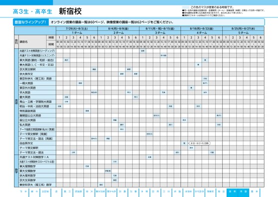 ●2025年度/夏期講習/東日本/麹町/高3・卒生/パターン34602025_56_3_328_11_20250328105233.csv/2ページ校了時削除高3生・高卒生新宿校この色のマスが授業のある時限です。●同一名称の講座は設置校舎・設置期間(ターム)・授業時間(時限)が異なっても同一内容です。●担当講師は変更になる場合がありますので、あらかじめご了承ください。●講師のフルネームはWebサイトでご確認ください。豊富なラインアップ!オンライン授業の講座一覧は60ページ、映像授業の講座一覧は62ページをご覧ください。7/29(火)~8/2(土)8/4(月)~8/8(金)8/11(月・祝)~8/15(金)8/18(月)~8/22(金)8/25(月)~8/27(水)1ターム341256122ターム3456123ターム3456124ターム3456125ターム345609:0010:5013:2015:1017:0018:5009:0010:5013:2015:1017:0018:5009:0010:5013:2015:1017:0018:5009:0010:5013:2015:1017:0018:5009:0010:5013:2015:1017:0018:50〜〜〜〜〜〜〜〜〜〜〜〜〜〜〜〜〜〜〜〜〜〜〜〜10:3012:2014:5016:4018:3020:2010:3012:2014:5016:4018:3020:2010:3012:2014:5016:4018:3020:2010:3012:2014:5016:4018:3020:2010:3012:2014:5016:4018:3020:20〜〜〜〜〜〜奥脇護守早川田中(久)奥脇小林石塚伊東(敦)香坂三木石塚飯田時限時間講座名教科共通テスト対策英語(リーディング)共通テスト対策英語(リスニング)東大英語(要約・和訳・総合)東大英語(LC・作文・文法)京大英文解釈京大英作文東京科学大(理工系)英語一橋大英語東京外大英語早大英語慶大英語青山・立教・学習院大英語明治・中央・法政大英語特別選抜英語難関国公立大英語国公立大英語私大英語テーマ超長文英語読解(私大)発展]テーマ英文解釈[発展]テーマ英文法・語法[発展]自由英作文テーマ英文解釈テーマ英文法・語法共通テスト対策数学IA共通テスト対策数学(ⅡB+ベクトル型)東大理類数学東大文類数学京大理系数学京大文系数学東京科学大(理工系)数学英語数学岩間吉川(量)新野新野新野早川早川天倉高沢近嵐小林近嵐奥脇柴田(卓)青柳青柳墺墺久地森(千)矢作墺矢作森(千)矢作田中(久)天倉成川赤木田中(久)永島幅8/20・8/21の2日間赤木成川中園●2025年度/夏期講習/東日本/新宿/高3・卒生/パターン3560金沢文庫南浦和津田沼柏あざみ野2025_56_3_329_11_20250328204139.csv/1ページ自由が丘秋葉原吉祥寺厚木町田立川調布水戸千葉川越大宮横浜藤沢池袋校了時削除新宿麹町本郷