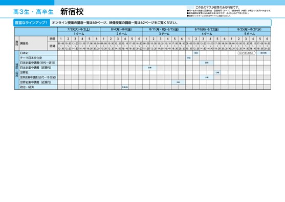 高3生・高卒生新宿校この色のマスが授業のある時限です。●同一名称の講座は設置校舎・設置期間(ターム)・授業時間(時限)が異なっても同一内容です。●担当講師は変更になる場合がありますので、あらかじめご了承ください。●講師のフルネームはWebサイトでご確認ください。豊富なラインアップ!オンライン授業の講座一覧は60ページ、映像授業の講座一覧は62ページをご覧ください。7/29(火)~8/2(土)8/4(月)~8/8(金)8/11(月・祝)~8/15(金)8/18(月)~8/22(金)8/25(月)~8/27(水)1ターム341256122ターム3456123ターム3456124ターム3456125ターム345609:0010:5013:2015:1017:0018:5009:0010:5013:2015:1017:0018:5009:0010:5013:2015:1017:0018:5009:0010:5013:2015:1017:0018:5009:0010:5013:2015:1017:0018:50〜〜〜〜〜〜〜〜〜〜〜〜〜〜〜〜〜〜〜〜〜〜〜〜〜〜〜〜〜〜10:3012:2014:5016:4018:3020:2010:3012:2014:5016:4018:3020:2010:3012:2014:5016:4018:3020:2010:3012:2014:5016:4018:3020:2010:3012:2014:5016:4018:3020:20依田依田8/27は5限のみ坂本(勝)富増平尾(則)沼田富増小嶋小嶋時限時間講座名教科日本史テーマ日本文化史日本史集中講義(古代―近世)日本史集中講義(近現代)世界史世界史集中講義(古代―18世紀)世界史集中講義(近現代)政治・経済地歴・公民●2025年度/夏期講習/東日本/新宿/高3・卒生/パターン35602025_56_3_329_11_20250328204139.csv/4ページ校了時削除