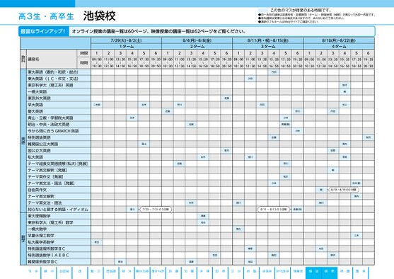 ●2025年度/夏期講習/東日本/新宿/高3・卒生/パターン35602025_56_3_329_11_20250328204139.csv/4ページ校了時削除高3生・高卒生池袋校この色のマスが授業のある時限です。●同一名称の講座は設置校舎・設置期間(ターム)・授業時間(時限)が異なっても同一内容です。●担当講師は変更になる場合がありますので、あらかじめご了承ください。●講師のフルネームはWebサイトでご確認ください。豊富なラインアップ!オンライン授業の講座一覧は60ページ、映像授業の講座一覧は62ページをご覧ください。7/29(火)~8/2(土)1ターム341256128/4(月)~8/8(金)2ターム348/11(月・祝)~8/15(金)8/18(月)~8/22(金)56123ターム3456124ターム345609:0011:0013:2015:2017:2019:2009:0011:0013:2015:2017:2019:2009:0011:0013:2015:2017:2019:2009:0011:0013:2015:2017:2019:20〜〜〜〜〜〜〜〜〜〜〜〜〜10:3012:3014:5016:5018:5020:5010:3012:3014:5016:5018:5020:5010:3012:3014:5016:5018:5020:5010:3012:3014:5016:5018:5020:50〜〜〜〜〜〜〜〜〜〜〜二本柳矢作早川近嵐矢作近嵐高山佐藤青木矢作成川近嵐丹羽久恒丹羽小林高橋(勝)早川小林近藤小林早川桜井桜井幅村上東内幸長丹羽岩間幅桜井木村(智)幅8/18・8/19の2日間東内三木麹町本郷清川7/29〜7/31の3日間矢作須藤刈谷成川尾台8/11〜8/13の3日間髙橋(保)清川尾台尾台須藤生田秦野生田飯田刈谷柳沢●2025年度/夏期講習/東日本/池袋/高3・卒生/パターン3460金沢文庫南浦和津田沼柏あざみ野2025_56_3_314_11_20250328204139.csv/1ページ自由が丘秋葉原吉祥寺厚木町田立川調布水戸千葉横浜藤沢大宮川越池袋校了時削除新宿時限時間講座名教科東大英語(要約・和訳・総合)東大英語(LC・作文・文法)東京科学大(理工系)英語一橋大英語東京外大英語早大英語慶大英語青山・立教・学習院大英語明治・中央・法政大英語今から間に合うGMARCH英語特別選抜英語難関国公立大英語国公立大英語私大英語テーマ超長文英語読解(私大)発展]テーマ英文解釈[発展]テーマ英作文[発展]テーマ英文法・語法[発展]自由英作文テーマ英文解釈テーマ英文法・語法知らないと損する熟語・イディオム東大理類数学東京科学大(理工系)数学一橋大数学早慶大理工数学私大薬学系数学特別選抜理系数学ⅢC特別選抜数学ⅠAⅡBC難関理系数学ⅢC英語数学