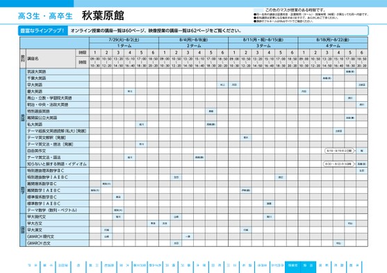 ●2025年度/夏期講習/東日本/池袋/高3・卒生/パターン34602025_56_3_314_11_20250328204139.csv/4ページ校了時削除高3生・高卒生秋葉原館この色のマスが授業のある時限です。●同一名称の講座は設置校舎・設置期間(ターム)・授業時間(時限)が異なっても同一内容です。●担当講師は変更になる場合がありますので、あらかじめご了承ください。●講師のフルネームはWebサイトでご確認ください。豊富なラインアップ!オンライン授業の講座一覧は60ページ、映像授業の講座一覧は62ページをご覧ください。7/29(火)~8/2(土)1ターム341256128/4(月)~8/8(金)2ターム348/11(月・祝)~8/15(金)8/18(月)~8/22(金)56123ターム3456124ターム345609:0010:5013:2015:1017:0018:5009:0010:5013:2015:1017:0018:5009:0010:5013:2015:1017:0018:5009:0010:5013:2015:1017:0018:50〜〜〜〜〜〜〜〜〜〜〜〜〜〜〜〜〜〜〜〜〜〜〜〜10:3012:2014:5016:4018:3020:2010:3012:2014:5016:4018:3020:2010:3012:2014:5016:4018:3020:2010:3012:2014:5016:4018:3020:20時限時間講座名教科筑波大英語千葉大英語早大英語慶大英語青山・立教・学習院大英語明治・中央・法政大英語特別選抜英語難関国公立大英語私大英語テーマ超長文英語読解(私大)発展]テーマ英文解釈[発展]テーマ英文法・語法[発展]自由英作文テーマ英文法・語法知らないと損する熟語・イディオム特別選抜理系数学ⅢC特別選抜数学ⅠAⅡBC難関理系数学ⅢC難関数学ⅠAⅡBC標準理系数学ⅢC標準数学ⅠAⅡBCテーマ数学(数列・ベクトル)早大現代文早大古文早大漢文GMARCH現代文GMARCH古文難関国公立大現代文(論述対策)難関古文難関漢文水戸千葉津田沼柏早川成川早川成川高橋(勝)高梨(大)高梨(大)島田高梨(大)菊川打越山崎生田山崎太田一瀬隼坂太田村上丹羽奥脇高橋(勝)青木伊東(鋼)打越髙橋(保)丹羽髙橋(保)清川池田(廉)土岐田清川土岐田8/18・8/19の2日間幅8/20〜8/22の3日間髙橋(保)生田渡辺遠藤菊川村山村山篠原阿部(誠)川越南浦和大宮金沢文庫あざみ野横浜藤沢厚木町田立川調布西川吉祥寺自由が丘秋葉原池袋新宿麹町本郷英語数学国語国語●2025年度/夏期講習/東日本/秋葉原/高3・卒生/パターン34602025_56_3_368_11_20250328204139.csv/1ページ校了時削除