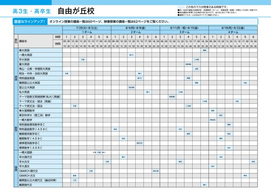 高3生・高卒生自由が丘校この色のマスが授業のある時限です。●同一名称の講座は設置校舎・設置期間(ターム)・授業時間(時限)が異なっても同一内容です。●担当講師は変更になる場合がありますので、あらかじめご了承ください。●講師のフルネームはWebサイトでご確認ください。豊富なラインアップ!オンライン授業の講座一覧は60ページ、映像授業の講座一覧は62ページをご覧ください。7/29(火)~8/2(土)1ターム341256128/4(月)~8/8(金)2ターム348/11(月・祝)~8/15(金)8/18(月)~8/22(金)56123ターム3456124ターム345609:0010:5013:2015:1017:0018:5009:0010:5013:2015:1017:0018:5009:0010:5013:2015:1017:0018:5009:0010:5013:2015:1017:0018:50〜〜〜〜〜〜〜〜〜〜〜〜〜10:3012:2014:5016:4018:3020:2010:3012:2014:5016:4018:3020:2010:3012:2014:5016:4018:3020:2010:3012:2014:5016:4018:3020:20〜〜〜〜〜〜〜〜〜〜〜天倉天倉天倉脇坂三河森(千)清川森(千)池田(廉)清川瀬﨑髙橋(慶)明慶二本柳水野明慶二本柳髙橋(慶)二本柳二本柳吉田松田松田菊川高田(宇)大窪・大野・西川大野大窪清水(直)村本堀尾隼坂香坂伊東(敦)板谷香坂木村横田板谷流川田中菊川吉田隼坂隼坂時限時間講座名教科東大英語一橋大英語早大英語慶大英語青山・立教・学習院大英語明治・中央・法政大英語特別選抜英語難関国公立大英語国公立大英語私大英語テーマ超長文英語読解(私大)発展]テーマ英文法・語法[発展]テーマ英文法・語法東大理類数学東京科学大(理工系)数学一橋大数学特別選抜理系数学ⅢC特別選抜数学ⅠAⅡBC難関理系数学ⅢC難関数学ⅠAⅡBC標準理系数学ⅢC標準数学ⅠAⅡBC一橋大国語早大現代文早大古文早大漢文GMARCH現代文GMARCH古文難関国公立大現代文(論述対策)難関現代文英語数学国語●2025年度/夏期講習/東日本/自由が丘/高3・卒生/パターン34602025_56_3_337_11_20250328213516.csv/1ページ校了時削除