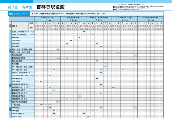 高3生・高卒生吉祥寺現役館この色のマスが授業のある時限です。●同一名称の講座は設置校舎・設置期間(ターム)・授業時間(時限)が異なっても同一内容です。●担当講師は変更になる場合がありますので、あらかじめご了承ください。●講師のフルネームはWebサイトでご確認ください。豊富なラインアップ!オンライン授業の講座一覧は60ページ、映像授業の講座一覧は62ページをご覧ください。7/29(火)~8/2(土)8/4(月)~8/8(金)8/11(月・祝)~8/15(金)8/18(月)~8/22(金)8/25(月)~8/27(水)1ターム341256122ターム3456123ターム3456124ターム3456125ターム345609:0010:5013:2015:1017:0018:5009:0010:5013:2015:1017:0018:5009:0010:5013:2015:1017:0018:5009:0010:5013:2015:1017:0018:5009:0010:5013:2015:1017:0018:50〜〜〜〜〜〜〜〜〜〜〜〜〜〜〜〜〜〜〜〜〜〜〜〜〜〜〜〜〜〜10:3012:2014:5016:4018:3020:2010:3012:2014:5016:4018:3020:2010:3012:2014:5016:4018:3020:2010:3012:2014:5016:4018:3020:2010:3012:2014:5016:4018:3020:20明慶墺東内青木二本柳小林伊藤(剛)吉田渡辺窪田渡辺秋山伊藤(武)・吉澤・酒井(辰)軽部小林竹内貴川桑原古谷塚本桑原・和田平賀軽部上田平賀田中(久)尾崎礒貝青柳高梨(大)矢作青柳東内香坂矢作福島長野香坂大窪久地内山(洋)木村時限時間講座名教科共通テスト対策英語(リーディング)共通テスト対策英語(リスニング)東大英語一橋大英語早大英語慶大英語青山・立教・学習院大英語明治・中央・法政大英語特別選抜英語難関国公立大英語国公立大英語私大英語テーマ英文法・語法[発展]テーマ英文法・語法共通テスト対策数学IA共通テスト対策数学(ⅡB+ベクトル型)東大理類数学一橋大数学特別選抜理系数学ⅢC特別選抜数学ⅠAⅡBC難関理系数学ⅢC難関数学ⅠAⅡBC標準理系数学ⅢC標準数学ⅠAⅡBC共通テスト対策国語一橋大国語早大現代文早大古文GMARCH現代文GMARCH古文英語数学国語●2025年度/夏期講習/東日本/吉祥寺/高3・卒生/パターン35602025_56_3_340_11_20250328204139.csv/1ページ校了時削除
