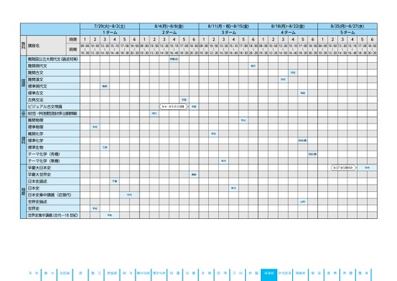 7/29(火)~8/2(土)8/4(月)~8/8(金)8/11(月・祝)~8/15(金)8/18(月)~8/22(金)8/25(月)~8/27(水)この色のマスが授業のある時限です。●同一名称の講座は設置校舎・設置期間(ターム)・授業時間(時限)が異なっても同一内容です。●担当講師は変更になる場合がありますので、あらかじめご了承ください。●講師のフルネームはWebサイトでご確認ください。1ターム431256122ターム4356123ターム4356124ターム4356125ターム435609:0010:5013:2015:1017:0018:5009:0010:5013:2015:1017:0018:5009:0010:5013:2015:1017:0018:5009:0010:5013:2015:1017:0018:5009:0010:5013:2015:1017:0018:50〜〜〜〜〜〜〜〜〜〜〜〜〜〜〜〜〜〜〜〜〜〜〜〜10:3012:2014:5016:4018:3020:2010:3012:2014:5016:4018:3020:2010:3012:2014:5016:4018:3020:2010:3012:2014:5016:4018:3020:2010:3012:2014:5016:4018:3020:20〜〜〜〜〜〜伊藤(武)平賀8/4・8/5の2日間平賀市川中村中村和田絵川杉山早川早川島崎早川向井(勇)向井(勇)山内8/27は5限のみ竹内軽部三浦木村千葉竹内平松平松高3生・高卒生時限時間講座名教科難関国公立大現代文(論述対策)難関現代文難関古文難関漢文標準現代文標準古文古典文法ビジュアル古文常識総合型・学校推薦型選抜対策(出願書類編)難関物理標準物理難関化学標準化学標準生物テーマ化学(有機)テーマ化学(無機)早慶大日本史早慶大世界史日本史論述日本史日本史集中講義(近現代)世界史論述世界史世界史集中講義(古代―18世紀)国語小論文理科地歴●2025年度/夏期講習/東日本/吉祥寺/高3・卒生/パターン35602025_56_3_340_11_20250328204139.csv/1ページ校了時削除●2025年度/夏期講習/東日本/吉祥寺/高3・卒生/パターン35602025_56_3_340_11_20250328204139.csv/2ページ校了時削除水戸千葉津田沼柏川越南浦和大宮金沢文庫あざみ野横浜藤沢厚木町田立川調布吉祥寺自由が丘秋葉原池袋新宿麹町本郷