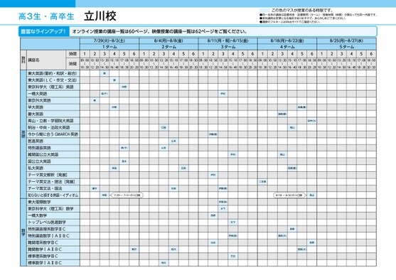 高3生・高卒生立川校この色のマスが授業のある時限です。●同一名称の講座は設置校舎・設置期間(ターム)・授業時間(時限)が異なっても同一内容です。●担当講師は変更になる場合がありますので、あらかじめご了承ください。●講師のフルネームはWebサイトでご確認ください。豊富なラインアップ!オンライン授業の講座一覧は60ページ、映像授業の講座一覧は62ページをご覧ください。7/29(火)~8/2(土)8/4(月)~8/8(金)8/11(月・祝)~8/15(金)8/18(月)~8/22(金)8/25(月)~8/27(水)1ターム341256122ターム3456123ターム3456124ターム3456125ターム345609:0010:5013:2015:1017:0018:5009:0010:5013:2015:1017:0018:5009:0010:5013:2015:1017:0018:5009:0010:5013:2015:1017:0018:5009:0010:5013:2015:1017:0018:50〜〜〜〜〜〜〜〜〜〜〜〜〜〜〜〜〜〜〜〜〜〜〜〜〜〜〜〜〜〜10:3012:2014:5016:4018:3020:2010:3012:2014:5016:4018:3020:2010:3012:2014:5016:4018:3020:2010:3012:2014:5016:4018:3020:2010:3012:2014:5016:4018:3020:20墺墺仲野森(千)墺仲野森(千)高木幸長護守仲野7/29〜7/31の3日間日髙山本山本日髙柳沢相川相川村伊藤(剛)髙橋(慶)髙橋(慶)田中(久)高山村高山日髙髙橋(慶)伊藤(剛)伊東(敦)木下村長野古谷木下伊東(敦)古谷二本柳8/18〜8/20の3日間高山長野高梨(大)長野高梨(大)時限時間講座名教科東大英語(要約・和訳・総合)東大英語(LC・作文・文法)東京科学大(理工系)英語一橋大英語東京外大英語早大英語慶大英語青山・立教・学習院大英語明治・中央・法政大英語今から間に合うGMARCH英語医進英語特別選抜英語難関国公立大英語国公立大英語私大英語テーマ英文解釈[発展]テーマ英文法・語法[発展]テーマ英文法・語法知らないと損する熟語・イディオム東大理類数学東京科学大(理工系)数学一橋大数学トップレベル医進数学特別選抜理系数学ⅢC特別選抜数学ⅠAⅡBC難関理系数学ⅢC難関数学ⅠAⅡBC標準理系数学ⅢC標準数学ⅠAⅡBC英語数学●2025年度/夏期講習/東日本/立川/高3・卒生/パターン35602025_56_3_315_11_20250328204139.csv/1ページ校了時削除