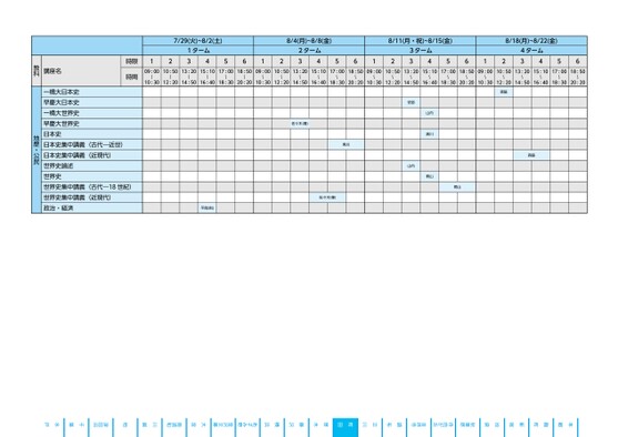7/29(火)~8/2(土)1ターム431256128/4(月)~8/8(金)2ターム43この色のマスが授業のある時限です。●同一名称の講座は設置校舎・設置期間(ターム)・授業時間(時限)が異なっても同一内容です。●担当講師は変更になる場合がありますので、あらかじめご了承ください。●講師のフルネームはWebサイトでご確認ください。8/11(月・祝)~8/15(金)8/18(月)~8/22(金)56123ターム4356124ターム435609:0010:5013:2015:1017:0018:5009:0010:5013:2015:1017:0018:5009:0010:5013:2015:1017:0018:5009:0010:5013:2015:1017:0018:50〜〜〜〜〜〜〜〜〜〜〜〜〜〜〜〜〜〜〜〜〜〜〜〜10:3012:2014:5016:4018:3020:2010:3012:2014:5016:4018:3020:2010:3012:2014:5016:4018:3020:2010:3012:2014:5016:4018:3020:20佐々木(尊)黒川平尾(則)佐々木(尊)森脇森脇安部山内山内黒川桐山桐山時限時間講座名教科一橋大日本史早慶大日本史一橋大世界史早慶大世界史日本史日本史集中講義(古代―近世)日本史集中講義(近現代)世界史論述世界史世界史集中講義(古代―18世紀)世界史集中講義(近現代)政治・経済地歴・公民高3生・高卒生●2025年度/夏期講習/東日本/町田/高3・卒生/パターン34602025_56_3_325_11_20250328204139.csv/2ページ校了時削除●2025年度/夏期講習/東日本/町田/高3・卒生/パターン3460金沢文庫大宮川越千葉水戸南浦和津田沼柏2025_56_3_325_11_20250328204139.csv/3ページ校了時削除あざみ野横浜藤沢厚木町田立川調布吉祥寺自由が丘秋葉原池袋新宿麹町本郷