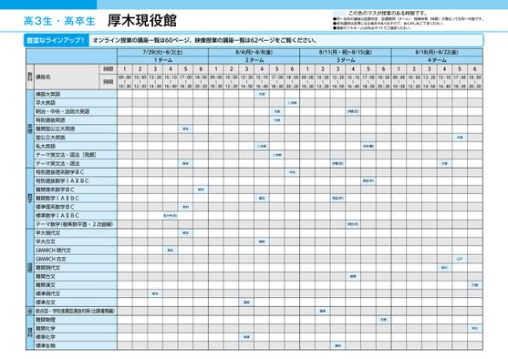 高3生・高卒生厚木現役館この色のマスが授業のある時限です。●同一名称の講座は設置校舎・設置期間(ターム)・授業時間(時限)が異なっても同一内容です。●担当講師は変更になる場合がありますので、あらかじめご了承ください。●講師のフルネームはWebサイトでご確認ください。豊富なラインアップ!オンライン授業の講座一覧は60ページ、映像授業の講座一覧は62ページをご覧ください。7/29(火)~8/2(土)1ターム341256128/4(月)~8/8(金)2ターム348/11(月・祝)~8/15(金)8/18(月)~8/22(金)56123ターム3456124ターム345609:0010:5013:2015:1017:0018:5009:0010:5013:2015:1017:0018:5009:0010:5013:2015:1017:0018:5009:0010:5013:2015:1017:0018:50〜〜〜〜〜〜〜〜〜〜〜〜〜10:3012:2014:5016:4018:3020:2010:3012:2014:5016:4018:3020:2010:3012:2014:5016:4018:3020:2010:3012:2014:5016:4018:3020:20〜〜〜〜〜〜〜〜〜〜〜安井岡本岩村森永岩村佐々木(夫)森永森永大胡二本柳大島大胡二本柳二本柳中谷富田渡部伊藤(宏)高田(宇)木村(麟)高田(宇)伊藤(宏)高田(宇)越野渡部安達藤巻倉田矢野犬塚犬塚山下絵川打越早川時限時間講座名教科横国大英語早大英語明治・中央・法政大英語特別選抜英語難関国公立大英語国公立大英語私大英語テーマ英文法・語法[発展]テーマ英文法・語法特別選抜理系数学ⅢC特別選抜数学ⅠAⅡBC難関理系数学ⅢC難関数学ⅠAⅡBC標準理系数学ⅢC標準数学ⅠAⅡBCテーマ数学(複素数平面・2次曲線)早大現代文早大古文GMARCH現代文GMARCH古文難関現代文難関古文難関漢文標準現代文標準古文総合型・学校推薦型選抜対策(出願書類編)難関物理難関化学標準化学標準生物英語数学国語小論文理科●2025年度/夏期講習/東日本/厚木/高3・卒生/パターン34602025_56_3_332_11_20250328105233.csv/1ページ校了時削除