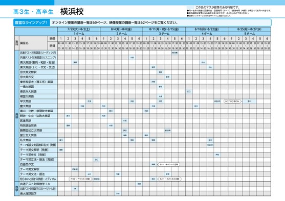 高3生・高卒生横浜校この色のマスが授業のある時限です。●同一名称の講座は設置校舎・設置期間(ターム)・授業時間(時限)が異なっても同一内容です。●担当講師は変更になる場合がありますので、あらかじめご了承ください。●講師のフルネームはWebサイトでご確認ください。豊富なラインアップ!オンライン授業の講座一覧は60ページ、映像授業の講座一覧は62ページをご覧ください。7/29(火)~8/2(土)8/4(月)~8/8(金)8/11(月・祝)~8/15(金)8/18(月)~8/22(金)8/25(月)~8/27(水)1ターム341256122ターム3456123ターム3456124ターム3456125ターム345609:0011:0013:2015:2017:2019:2009:0011:0013:2015:2017:2019:2009:0011:0013:2015:2017:2019:2009:0011:0013:2015:2017:2019:2009:0011:0013:2015:2017:2019:20〜〜〜〜〜〜〜〜〜〜〜〜〜〜〜〜〜〜〜〜〜〜〜〜〜〜〜〜〜〜10:3012:3014:5016:5018:5020:5010:3012:3014:5016:5018:5020:5010:3012:3014:5016:5018:5020:5010:3012:3014:5016:5018:5020:5010:3012:3014:5016:5018:5020:50遠藤清川遠藤清川遠藤丹羽中園丹羽大胡清川大胡小森天倉新野仲野新野瀬﨑新野大胡仲野大胡大胡小森押田海藤池田(廉)栗原幸長栗原池田(廉)小山小山田口田口柴田(卓)8/27は3限のみ香川松本柴田(卓)村山口伊藤(宏)山口7/29〜7/31の3日間髙橋(保)堺可愛渋谷遠藤8/11・8/12の2日間仲野清川8/11〜8/13の3日間吉崎時限時間講座名教科共通テスト対策英語(リーディング)共通テスト対策英語(リスニング)東大英語(要約・和訳・総合)東大英語(LC・作文・文法)京大英文解釈京大英作文東京科学大(理工系)英語一橋大英語東京外大英語横国大英語早大英語慶大英語青山・立教・学習院大英語明治・中央・法政大英語医進英語特別選抜英語難関国公立大英語国公立大英語私大英語テーマ超長文英語読解(私大)発展]テーマ英文解釈[発展]テーマ英作文[発展]テーマ英文法・語法[発展]自由英作文テーマ英文解釈テーマ英文法・語法知らないと損する熟語・イディオム共通テスト対策数学IA共通テスト対策数学(ⅡB+ベクトル型)東大理類数学英語数学●2025年度/夏期講習/東日本/横浜/高3・卒生/パターン35602025_56_3_321_11_20250328204139.csv/1ページ校了時削除