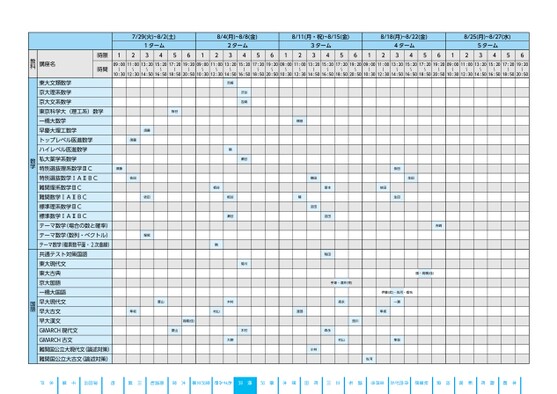 7/29(火)~8/2(土)8/4(月)~8/8(金)8/11(月・祝)~8/15(金)8/18(月)~8/22(金)8/25(月)~8/27(水)この色のマスが授業のある時限です。●同一名称の講座は設置校舎・設置期間(ターム)・授業時間(時限)が異なっても同一内容です。●担当講師は変更になる場合がありますので、あらかじめご了承ください。●講師のフルネームはWebサイトでご確認ください。1ターム431256122ターム4356123ターム4356124ターム4356125ターム435609:0011:0013:2015:2017:2019:2009:0011:0013:2015:2017:2019:2009:0011:0013:2015:2017:2019:2009:0011:0013:2015:2017:2019:2009:0011:0013:2015:2017:2019:20〜〜〜〜〜〜〜〜〜〜〜〜〜〜〜〜〜〜〜〜〜〜〜〜10:3012:3014:5016:5018:5020:5010:3012:3014:5016:5018:5020:5010:3012:3014:5016:5018:5020:5010:3012:3014:5016:5018:5020:5010:3012:3014:5016:5018:5020:50〜〜〜〜〜〜板谷須藤依田須藤須藤依田堀尾板谷隣菱山隼坂村山髙橋(佳)菱山吉崎渋谷吉崎隣瀬谷板谷瀬谷木村大野横田横田迫田隣塚本迫田税田生田依田生田依田吉崎菊川園・髙橋(佳)手塚・酒井(完)伊藤(武)・佐河・蝦名渡部木村森永森永村山隼坂西川一瀬隼坂小林佐河高3生・高卒生時限時間講座名教科東大文類数学京大理系数学京大文系数学東京科学大(理工系)数学一橋大数学早慶大理工数学トップレベル医進数学ハイレベル医進数学私大薬学系数学特別選抜理系数学ⅢC特別選抜数学ⅠAⅡBC難関理系数学ⅢC難関数学ⅠAⅡBC標準理系数学ⅢC標準数学ⅠAⅡBCテーマ数学(場合の数と確率)テーマ数学(数列・ベクトル)テーマ数学(複素数平面・2次曲線)共通テスト対策国語東大現代文東大古典京大国語一橋大国語早大現代文早大古文早大漢文GMARCH現代文GMARCH古文難関国公立大現代文(論述対策)難関国公立大古文(論述対策)数学国語●2025年度/夏期講習/東日本/横浜/高3・卒生/パターン3560金沢文庫大宮川越千葉水戸南浦和津田沼柏2025_56_3_321_11_20250328204139.csv/2ページ校了時削除あざみ野横浜藤沢厚木町田立川調布吉祥寺自由が丘秋葉原池袋新宿麹町本郷●2025年度/夏期講習/東日本/横浜/高3・卒生/パターン35602025_56_3_321_11_20250328204139.csv/1ページ校了時削除