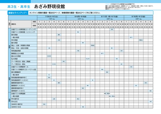 高3生・高卒生あざみ野現役館この色のマスが授業のある時限です。●同一名称の講座は設置校舎・設置期間(ターム)・授業時間(時限)が異なっても同一内容です。●担当講師は変更になる場合がありますので、あらかじめご了承ください。●講師のフルネームはWebサイトでご確認ください。豊富なラインアップ!オンライン授業の講座一覧は60ページ、映像授業の講座一覧は62ページをご覧ください。7/29(火)~8/2(土)1ターム341256128/4(月)~8/8(金)2ターム348/11(月・祝)~8/15(金)8/18(月)~8/22(金)56123ターム3456124ターム345609:0010:5013:2015:1017:0018:5009:0010:5013:2015:1017:0018:5009:0010:5013:2015:1017:0018:5009:0010:5013:2015:1017:0018:50〜〜〜〜〜〜〜〜〜〜〜〜〜10:3012:2014:5016:4018:3020:2010:3012:2014:5016:4018:3020:2010:3012:2014:5016:4018:3020:2010:3012:2014:5016:4018:3020:20〜〜〜〜〜〜〜〜〜〜〜瀬﨑大胡大島吉川(幸)川口板谷伊吹吉川(幸)川口堀尾岡本中島岡本伊藤(剛)吉田清川森(千)内山(洋)吉田隣國分塚本岡田岡田斎藤・伊藤(恭)斎藤・伊藤(恭)山崎菱山菱山宮崎森(千)伊藤(宏)安井清川古谷依田古谷福島大野時限時間講座名教科共通テスト対策英語(リーディング)共通テスト対策英語(リスニング)東大英語一橋大英語早大英語慶大英語青山・立教・学習院大英語明治・中央・法政大英語特別選抜英語難関国公立大英語国公立大英語私大英語テーマ英文法・語法[発展]テーマ英文法・語法共通テスト対策数学IA共通テスト対策数学(ⅡB+ベクトル型)東大理類数学一橋大数学特別選抜理系数学ⅢC特別選抜数学ⅠAⅡBC難関理系数学ⅢC難関数学ⅠAⅡBC標準理系数学ⅢC標準数学ⅠAⅡBC共通テスト対策国語一橋大国語早大現代文早大古文GMARCH現代文GMARCH古文英語数学国語●2025年度/夏期講習/東日本/あざみ野/高3・卒生/パターン34602025_56_3_339_11_20250328204139.csv/1ページ校了時削除