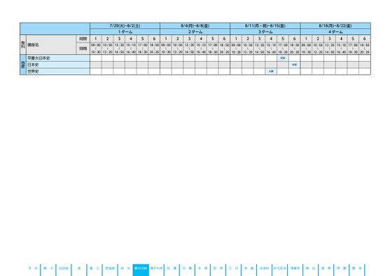 7/29(火)~8/2(土)1ターム431256128/4(月)~8/8(金)2ターム43この色のマスが授業のある時限です。●同一名称の講座は設置校舎・設置期間(ターム)・授業時間(時限)が異なっても同一内容です。●担当講師は変更になる場合がありますので、あらかじめご了承ください。●講師のフルネームはWebサイトでご確認ください。8/11(月・祝)~8/15(金)8/18(月)~8/22(金)56123ターム4356124ターム435609:0010:5013:2015:1017:0018:5009:0010:5013:2015:1017:0018:5009:0010:5013:2015:1017:0018:5009:0010:5013:2015:1017:0018:50〜〜〜〜〜〜〜〜〜〜〜〜〜〜〜〜〜〜〜〜〜〜〜〜10:3012:2014:5016:4018:3020:2010:3012:2014:5016:4018:3020:2010:3012:2014:5016:4018:3020:2010:3012:2014:5016:4018:3020:20安部安部大野時限時間講座名早慶大日本史日本史世界史教科地歴高3生・高卒生●2025年度/夏期講習/東日本/金沢文庫/高3・卒生/パターン34602025_56_3_335_11_20250328105233.csv/1ページ校了時削除●2025年度/夏期講習/東日本/金沢文庫/高3・卒生/パターン34602025_56_3_335_11_20250328105233.csv/2ページ校了時削除水戸千葉津田沼柏川越南浦和大宮金沢文庫あざみ野横浜藤沢厚木町田立川調布吉祥寺自由が丘秋葉原池袋新宿麹町本郷
