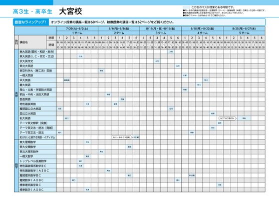 高3生・高卒生大宮校この色のマスが授業のある時限です。●同一名称の講座は設置校舎・設置期間(ターム)・授業時間(時限)が異なっても同一内容です。●担当講師は変更になる場合がありますので、あらかじめご了承ください。●講師のフルネームはWebサイトでご確認ください。豊富なラインアップ!オンライン授業の講座一覧は60ページ、映像授業の講座一覧は62ページをご覧ください。7/29(火)~8/2(土)8/4(月)~8/8(金)8/11(月・祝)~8/15(金)8/18(月)~8/22(金)8/25(月)~8/27(水)1ターム341256122ターム3456123ターム3456124ターム3456125ターム345609:0010:5013:2015:1017:0018:5009:0010:5013:2015:1017:0018:5009:0010:5013:2015:1017:0018:5009:0010:5013:2015:1017:0018:5009:0010:5013:2015:1017:0018:50〜〜〜〜〜〜〜〜〜〜〜〜〜〜〜〜〜〜〜〜〜〜〜〜10:3012:2014:5016:4018:3020:2010:3012:2014:5016:4018:3020:2010:3012:2014:5016:4018:3020:2010:3012:2014:5016:4018:3020:2010:3012:2014:5016:4018:3020:20〜〜〜〜〜〜時限時間講座名教科久地仲野髙橋(慶)成川川原成川久地渋谷秦野永島口大澤口久恒山川山川川原仲野早川早川仲野佐藤金城山川8/4〜8/6の3日間木村(麟)尾台尾台飯田口この色のマスが授業のある時限です。●同一名称の講座は設置校舎・設置期間(ターム)・授業時間(時限)が異なっても同一内容です。●担当講師は変更になる場合がありますので、あらかじめご了承ください。●講師のフルネームはWebサイトでご確認ください。岩間8/27は3限のみ幸長礒貝早川仲野中村(隆)國分河本東大英語(要約・和訳・総合)東大英語(LC・作文・文法)京大英作文東北大英語東京科学大(理工系)英語一橋大英語早大英語慶大英語青山・立教・学習院大英語明治・中央・法政大英語医進英語特別選抜英語難関国公立大英語国公立大英語私大英語テーマ英文解釈[発展]テーマ英文法・語法[発展]テーマ英文法・語法知らないと損する熟語・イディオム東大理類数学東大文類数学東北大理系数学一橋大数学トップレベル医進数学特別選抜理系数学ⅢC特別選抜数学ⅠAⅡBC難関理系数学ⅢC難関数学ⅠAⅡBC標準理系数学ⅢC標準数学ⅠAⅡBC英語数学高3生・高卒生●2025年度/夏期講習/東日本/大宮/高3・卒生/パターン35602025_56_3_324_11_20250328204139.csv/1ページ校了時削除