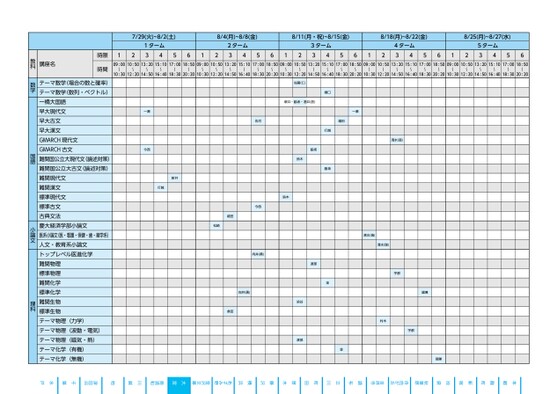 ●2025年度/夏期講習/東日本/大宮/高3・卒生/パターン35602025_56_3_324_11_20250328204139.csv/1ページ校了時削除高3生・高卒生7/29(火)~8/2(土)8/4(月)~8/8(金)8/11(月・祝)~8/15(金)この色のマスが授業のある時限です。●同一名称の講座は設置校舎・設置期間(ターム)・授業時間(時限)が異なっても同一内容です。●担当講師は変更になる場合がありますので、あらかじめご了承ください。●講師のフルネームはWebサイトでご確認ください。8/18(月)~8/22(金)8/25(月)~8/27(水)講座名時限時間1ターム431256122ターム4356123ターム4356124ターム4356125ターム435609:0010:5013:2015:1017:0018:5009:0010:5013:2015:1017:0018:5009:0010:5013:2015:1017:0018:5009:0010:5013:2015:1017:0018:5009:0010:5013:2015:1017:0018:50〜〜〜〜〜〜〜〜〜〜〜〜〜〜〜〜〜〜〜〜〜〜〜〜10:3012:2014:5016:4018:3020:2010:3012:2014:5016:4018:3020:2010:3012:2014:5016:4018:3020:2010:3012:2014:5016:4018:3020:2010:3012:2014:5016:4018:3020:20〜〜〜〜〜〜佐河佐藤(仁)新井・脇坂・酒井(辰)脇坂鈴木口打越脇坂一瀬福田清水(直)一瀬今西新井打越高3生・高卒生テーマ数学(場合の数と確率)テーマ数学(数列・ベクトル)一橋大国語早大現代文早大古文早大漢文GMARCH現代文GMARCH古文難関国公立大現代文(論述対策)難関国公立大古文(論述対策)難関現代文難関漢文標準現代文標準古文古典文法慶大経済学部小論文医系小論文(医・看護・保健・歯・薬学系)人文・教育系小論文トップレベル医進化学難関物理標準物理難関化学標準化学難関生物標準生物テーマ物理(力学)テーマ物理(波動・電気)テーマ物理(磁気・熱)テーマ化学(有機)テーマ化学(無機)教科数学国語小論文理科鈴木今西福田松崎向井(勇)向井(勇)倉田この色のマスが授業のある時限です。●同一名称の講座は設置校舎・設置期間(ターム)・授業時間(時限)が異なっても同一内容です。●担当講師は変更になる場合がありますので、あらかじめご了承ください。●講師のフルネームはWebサイトでご確認ください。清水(瑞)清水(瑞)渡部金染谷渡部宇都國兼村木宇都金國兼2025_56_3_324_11_20250328204139.csv/2ページ校了時削除あざみ野横浜藤沢厚木町田立川調布吉祥寺自由が丘秋葉原池袋新宿麹町本郷●2025年度/夏期講習/東日本/大宮/高3・卒生/パターン3560金沢文庫大宮川越千葉水戸南浦和津田沼柏