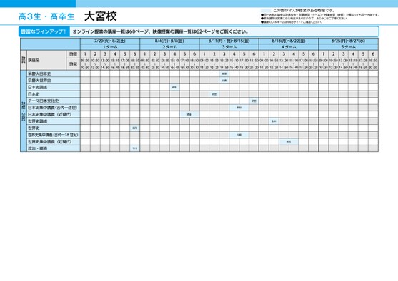 高3生・高卒生大宮校この色のマスが授業のある時限です。●同一名称の講座は設置校舎・設置期間(ターム)・授業時間(時限)が異なっても同一内容です。●担当講師は変更になる場合がありますので、あらかじめご了承ください。●講師のフルネームはWebサイトでご確認ください。豊富なラインアップ!オンライン授業の講座一覧は60ページ、映像授業の講座一覧は62ページをご覧ください。7/29(火)~8/2(土)8/4(月)~8/8(金)8/11(月・祝)~8/15(金)8/18(月)~8/22(金)8/25(月)~8/27(水)1ターム341256122ターム3456123ターム3456124ターム3456125ターム345609:0010:5013:2015:1017:0018:5009:0010:5013:2015:1017:0018:5009:0010:5013:2015:1017:0018:5009:0010:5013:2015:1017:0018:5009:0010:5013:2015:1017:0018:50〜〜〜〜〜〜〜〜〜〜〜〜〜〜〜〜〜〜〜〜〜〜〜〜〜〜〜〜〜〜10:3012:2014:5016:4018:3020:2010:3012:2014:5016:4018:3020:2010:3012:2014:5016:4018:3020:2010:3012:2014:5016:4018:3020:2010:3012:2014:5016:4018:3020:20依田小嶋依田森脇森脇依田依田小嶋永井永井髙岡平川時限時間講座名教科早慶大日本史早慶大世界史日本史論述日本史テーマ日本文化史日本史集中講義(古代―近世)日本史集中講義(近現代)世界史論述世界史世界史集中講義(古代―18世紀)世界史集中講義(近現代)政治・経済地歴・公民●2025年度/夏期講習/東日本/大宮/高3・卒生/パターン35602025_56_3_324_11_20250328204139.csv/3ページ校了時削除