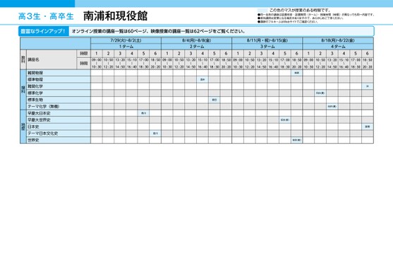 高3生・高卒生南浦和現役館この色のマスが授業のある時限です。●同一名称の講座は設置校舎・設置期間(ターム)・授業時間(時限)が異なっても同一内容です。●担当講師は変更になる場合がありますので、あらかじめご了承ください。●講師のフルネームはWebサイトでご確認ください。豊富なラインアップ!オンライン授業の講座一覧は60ページ、映像授業の講座一覧は62ページをご覧ください。7/29(火)~8/2(土)1ターム341256128/4(月)~8/8(金)2ターム348/11(月・祝)~8/15(金)8/18(月)~8/22(金)56123ターム3456124ターム345609:0010:5013:2015:1017:0018:5009:0010:5013:2015:1017:0018:5009:0010:5013:2015:1017:0018:5009:0010:5013:2015:1017:0018:50〜〜〜〜〜〜〜〜〜〜〜〜〜10:3012:2014:5016:4018:3020:2010:3012:2014:5016:4018:3020:2010:3012:2014:5016:4018:3020:2010:3012:2014:5016:4018:3020:20〜〜〜〜〜〜〜〜〜〜〜酒井倉田西川西川宮原坂本(新)坂本(新)向井(勇)向井(勇)沖富増時限時間難関物理標準物理難関化学標準化学標準生物テーマ化学(無機)早慶大日本史早慶大世界史日本史テーマ日本文化史世界史理科地歴講座名教科●2025年度/夏期講習/東日本/南浦和/高3・卒生/パターン34602025_56_3_336_11_20250328204139.csv/2ページ校了時削除
