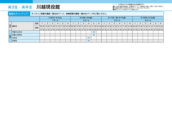 高3生・高卒生川越現役館この色のマスが授業のある時限です。●同一名称の講座は設置校舎・設置期間(ターム)・授業時間(時限)が異なっても同一内容です。●担当講師は変更になる場合がありますので、あらかじめご了承ください。●講師のフルネームはWebサイトでご確認ください。豊富なラインアップ!オンライン授業の講座一覧は60ページ、映像授業の講座一覧は62ページをご覧ください。7/29(火)~8/2(土)1ターム341256128/4(月)~8/8(金)2ターム348/11(月・祝)~8/15(金)8/18(月)~8/22(金)56123ターム3456124ターム345609:0010:5013:2015:1017:0018:5009:0010:5013:2015:1017:0018:5009:0010:5013:2015:1017:0018:5009:0010:5013:2015:1017:0018:50〜〜〜〜〜〜〜〜〜〜〜〜〜10:3012:2014:5016:4018:3020:2010:3012:2014:5016:4018:3020:2010:3012:2014:5016:4018:3020:2010:3012:2014:5016:4018:3020:20〜〜〜〜〜〜〜〜〜〜〜太田斉藤太田斉藤時限時間講座名早慶大日本史早慶大世界史日本史世界史教科地歴●2025年度/夏期講習/東日本/川越/高3・卒生/パターン34602025_56_3_333_11_20250328105233.csv/2ページ校了時削除