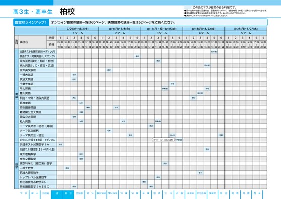 ●2025年度/夏期講習/東日本/川越/高3・卒生/パターン34602025_56_3_333_11_20250328105233.csv/2ページ校了時削除高3生・高卒生柏校この色のマスが授業のある時限です。●同一名称の講座は設置校舎・設置期間(ターム)・授業時間(時限)が異なっても同一内容です。●担当講師は変更になる場合がありますので、あらかじめご了承ください。●講師のフルネームはWebサイトでご確認ください。豊富なラインアップ!オンライン授業の講座一覧は60ページ、映像授業の講座一覧は62ページをご覧ください。7/29(火)~8/2(土)8/4(月)~8/8(金)8/11(月・祝)~8/15(金)8/18(月)~8/22(金)8/25(月)~8/27(水)1ターム341256122ターム3456123ターム3456124ターム3456125ターム345609:0010:5013:2015:1017:0018:5009:0010:5013:2015:1017:0018:5009:0010:5013:2015:1017:0018:5009:0010:5013:2015:1017:0018:5009:0010:5013:2015:1017:0018:50〜〜〜〜〜〜〜〜〜〜〜〜〜〜〜〜〜〜〜〜〜〜〜〜10:3012:2014:5016:4018:3020:2010:3012:2014:5016:4018:3020:2010:3012:2014:5016:4018:3020:2010:3012:2014:5016:4018:3020:2010:3012:2014:5016:4018:3020:20〜〜〜〜〜〜是枝高沢高沢田村(喜)田村(喜)平林伊藤(直)仲野田村(喜)岩舩篠原松本成川松本高橋(勝)高沢成川えんどう仲野8/11〜8/13の3日間伊藤(直)宮本宮本成合郷田郷田郷田桜井山川高山岩間永島飯島飯島山川加藤岩間鈴木飯島時限時間講座名教科共通テスト対策英語(リーディング)共通テスト対策英語(リスニング)東大英語(要約・和訳・総合)東大英語(LC・作文・文法)京大英文解釈一橋大英語筑波大英語千葉大英語早大英語慶大英語明治・中央・法政大英語医進英語特別選抜英語難関国公立大英語国公立大英語私大英語テーマ英文法・語法[発展]テーマ英文解釈テーマ英文法・語法知らないと損する熟語・イディオム共通テスト対策数学IA共通テスト対策数学(ⅡB+ベクトル型)東大理類数学東大文類数学東京科学大(理工系)数学一橋大数学筑波大理系数学トップレベル医進数学特別選抜理系数学ⅢC特別選抜数学ⅠAⅡBC英語数学●2025年度/夏期講習/東日本/柏/高3・卒生/パターン3560金沢文庫南浦和津田沼柏2025_56_3_322_11_20250328204139.csv/1ページあざみ野自由が丘秋葉原吉祥寺厚木町田立川調布水戸千葉横浜藤沢川越大宮池袋新宿校了時削除麹町本郷