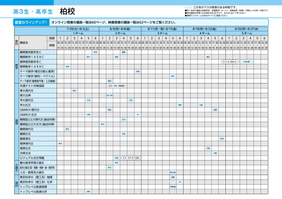 高3生・高卒生柏校この色のマスが授業のある時限です。●同一名称の講座は設置校舎・設置期間(ターム)・授業時間(時限)が異なっても同一内容です。●担当講師は変更になる場合がありますので、あらかじめご了承ください。●講師のフルネームはWebサイトでご確認ください。豊富なラインアップ!オンライン授業の講座一覧は60ページ、映像授業の講座一覧は62ページをご覧ください。7/29(火)~8/2(土)8/4(月)~8/8(金)8/11(月・祝)~8/15(金)8/18(月)~8/22(金)8/25(月)~8/27(水)1ターム341256122ターム3456123ターム3456124ターム3456125ターム345609:0010:5013:2015:1017:0018:5009:0010:5013:2015:1017:0018:5009:0010:5013:2015:1017:0018:5009:0010:5013:2015:1017:0018:5009:0010:5013:2015:1017:0018:50〜〜〜〜〜〜〜〜〜〜〜〜〜〜〜〜〜〜〜〜〜〜〜〜〜〜〜〜〜〜10:3012:2014:5016:4018:3020:2010:3012:2014:5016:4018:3020:2010:3012:2014:5016:4018:3020:2010:3012:2014:5016:4018:3020:2010:3012:2014:5016:4018:3020:20鈴木鈴木遠藤郷田島田8/27は3限のみ中村(隆)永島中郷田立川・今西・高橋(健)佐河・宮本荒田佐河小林立川中西8/4・8/5の2日間今西宮元宮元永島鈴木鈴木鈴木小池今西浅利鈴木隼坂川崎松藤田中川崎川崎清水(唯)加藤中野(喜)沖時限時間講座名教科難関理系数学ⅢC難関数学ⅠAⅡBC標準理系数学ⅢC標準数学ⅠAⅡBCテーマ数学(場合の数と確率)テーマ数学(数列・ベクトル)テーマ数学(複素数平面・2次曲線)共通テスト対策国語東大現代文東大古典早大現代文早大古文GMARCH現代文GMARCH古文難関国公立大現代文(論述対策)難関国公立大古文(論述対策)難関現代文難関古文難関漢文標準現代文標準古文古典文法ビジュアル古文常識慶大経済学部小論文医系小論文(医・看護・保健・歯・薬学系)人文・教育系小論文東京科学大(理工系)物理東京科学大(理工系)化学トップレベル医進物理トップレベル医進化学数学国語小論文理科●2025年度/夏期講習/東日本/柏/高3・卒生/パターン35602025_56_3_322_11_20250328204139.csv/2ページ校了時削除