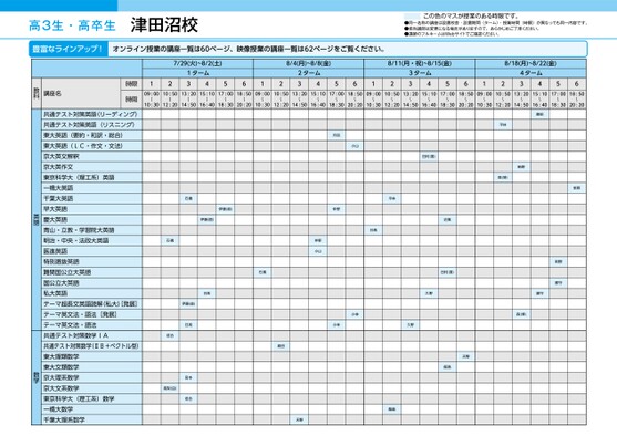 高3生・高卒生津田沼校この色のマスが授業のある時限です。●同一名称の講座は設置校舎・設置期間(ターム)・授業時間(時限)が異なっても同一内容です。●担当講師は変更になる場合がありますので、あらかじめご了承ください。●講師のフルネームはWebサイトでご確認ください。豊富なラインアップ!オンライン授業の講座一覧は60ページ、映像授業の講座一覧は62ページをご覧ください。7/29(火)~8/2(土)1ターム341256128/4(月)~8/8(金)2ターム348/11(月・祝)~8/15(金)8/18(月)~8/22(金)56123ターム3456124ターム345609:0010:5013:2015:1017:0018:5009:0010:5013:2015:1017:0018:5009:0010:5013:2015:1017:0018:5009:0010:5013:2015:1017:0018:50〜〜〜〜〜〜〜〜〜〜〜〜〜10:3012:2014:5016:4018:3020:2010:3012:2014:5016:4018:3020:2010:3012:2014:5016:4018:3020:2010:3012:2014:5016:4018:3020:20〜〜〜〜〜〜〜〜〜〜〜丹羽小山田村(喜)平林日髙仲野仲野小山近嵐田村(喜)藤田平林新野森(博)新野新野護守久野護守小林小林久野森(博)天野飯島天野飯島石橋伊藤(直)伊藤(直)石橋成合日髙伊藤(直)日髙高梨(由)宮本成合石橋島田時限時間講座名教科共通テスト対策英語(リーディング)共通テスト対策英語(リスニング)東大英語(要約・和訳・総合)東大英語(LC・作文・文法)京大英文解釈京大英作文東京科学大(理工系)英語一橋大英語千葉大英語早大英語慶大英語青山・立教・学習院大英語明治・中央・法政大英語医進英語特別選抜英語難関国公立大英語国公立大英語私大英語テーマ超長文英語読解(私大)発展]テーマ英文法・語法[発展]テーマ英文法・語法共通テスト対策数学IA共通テスト対策数学(ⅡB+ベクトル型)東大理類数学東大文類数学京大理系数学京大文系数学東京科学大(理工系)数学一橋大数学千葉大理系数学英語数学●2025年度/夏期講習/東日本/津田沼/高3・卒生/パターン34602025_56_3_327_11_20250328204139.csv/1ページ校了時削除