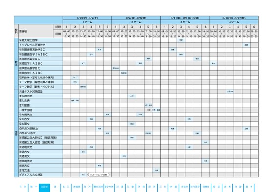 ●2025年度/夏期講習/東日本/津田沼/高3・卒生/パターン34602025_56_3_327_11_20250328204139.csv/1ページ校了時削除7/29(火)~8/2(土)1ターム431256128/4(月)~8/8(金)2ターム43この色のマスが授業のある時限です。●同一名称の講座は設置校舎・設置期間(ターム)・授業時間(時限)が異なっても同一内容です。●担当講師は変更になる場合がありますので、あらかじめご了承ください。●講師のフルネームはWebサイトでご確認ください。8/11(月・祝)~8/15(金)8/18(月)~8/22(金)56123ターム4356124ターム435609:0010:5013:2015:1017:0018:5009:0010:5013:2015:1017:0018:5009:0010:5013:2015:1017:0018:5009:0010:5013:2015:1017:0018:50〜〜〜〜〜〜〜〜〜〜〜〜〜〜〜〜〜〜〜〜〜〜〜〜10:3012:2014:5016:4018:3020:2010:3012:2014:5016:4018:3020:2010:3012:2014:5016:4018:3020:2010:3012:2014:5016:4018:3020:20時限時間講座名教科早慶大理工数学トップレベル医進数学特別選抜理系数学ⅢC特別選抜数学ⅠAⅡBC難関理系数学ⅢC難関数学ⅠAⅡBC標準理系数学ⅢC標準数学ⅠAⅡBC理系数学(思考と視点の探究)テーマ数学(場合の数と確率)テーマ数学(数列・ベクトル)共通テスト対策国語東大現代文東大古典京大国語一橋大国語早大現代文早大古文早大漢文GMARCH現代文GMARCH古文難関国公立大現代文(論述対策)難関国公立大古文(論述対策)難関現代文難関古文難関漢文標準現代文標準古文古典文法ビジュアル古文常識数学国語高3生・高卒生木下木下三木高梨(由)藤澤・中村天野飯島須藤天野天野柳沢宮本木下宮本高梨(由)高梨(由)大窪・藤澤大窪・中西・豊崎山崎松藤阿部(順)大窪光田手塚光田中西小宮川崎中西小宮平賀兵頭中村兵頭平賀兵頭平賀遠藤上野上野・中●2025年度/夏期講習/東日本/津田沼/高3・卒生/パターン34602025_56_3_327_11_20250328204139.csv/2ページ校了時削除水戸千葉津田沼柏川越南浦和大宮金沢文庫あざみ野横浜藤沢厚木町田立川調布吉祥寺自由が丘秋葉原池袋新宿麹町本郷平賀7/29・7/30の2日間川崎