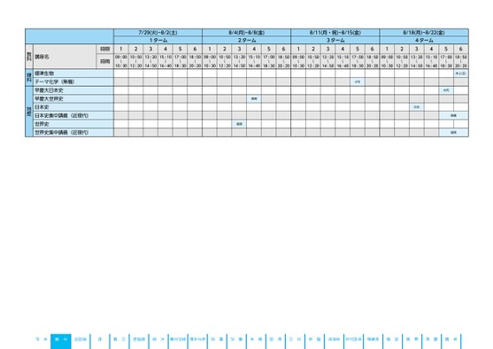 7/29(火)~8/2(土)1ターム431256128/4(月)~8/8(金)2ターム43この色のマスが授業のある時限です。●同一名称の講座は設置校舎・設置期間(ターム)・授業時間(時限)が異なっても同一内容です。●担当講師は変更になる場合がありますので、あらかじめご了承ください。●講師のフルネームはWebサイトでご確認ください。8/11(月・祝)~8/15(金)8/18(月)~8/22(金)56123ターム4356124ターム435609:0010:5013:2015:1017:0018:5009:0010:5013:2015:1017:0018:5009:0010:5013:2015:1017:0018:5009:0010:5013:2015:1017:0018:50〜〜〜〜〜〜〜〜〜〜〜〜〜〜〜〜〜〜〜〜〜〜〜〜10:3012:2014:5016:4018:3020:2010:3012:2014:5016:4018:3020:2010:3012:2014:5016:4018:3020:2010:3012:2014:5016:4018:3020:20髙岡髙岡小竹大内井上(正)大内髙橋髙岡2025_56_3_334_11_20250328204139.csv/2ページ校了時削除あざみ野横浜藤沢厚木町田立川調布吉祥寺自由が丘秋葉原池袋新宿麹町本郷●2025年度/夏期講習/東日本/千葉/高3・卒生/パターン34602025_56_3_334_11_20250328204139.csv/1ページ校了時削除時限時間講座名標準生物テーマ化学(無機)早慶大日本史早慶大世界史日本史日本史集中講義(近現代)世界史世界史集中講義(近現代)教科理科地歴高3生・高卒生●2025年度/夏期講習/東日本/千葉/高3・卒生/パターン3460金沢文庫大宮川越千葉水戸南浦和津田沼柏