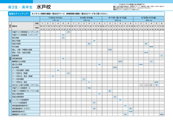 高3生・高卒生水戸校この色のマスが授業のある時限です。●同一名称の講座は設置校舎・設置期間(ターム)・授業時間(時限)が異なっても同一内容です。●担当講師は変更になる場合がありますので、あらかじめご了承ください。●講師のフルネームはWebサイトでご確認ください。豊富なラインアップ!オンライン授業の講座一覧は60ページ、映像授業の講座一覧は62ページをご覧ください。7/29(火)~8/2(土)1ターム341256128/4(月)~8/8(金)2ターム348/11(月・祝)~8/15(金)8/18(月)~8/22(金)56123ターム3456124ターム345609:1511:0513:3015:2017:1019:0009:1511:0513:3015:2017:1019:0009:1511:0513:3015:2017:1019:0009:1511:0513:3015:2017:1019:00〜〜〜〜〜〜〜〜〜〜〜〜〜10:4512:3515:0016:5018:4020:3010:4512:3515:0016:5018:4020:3010:4512:3515:0016:5018:4020:3010:4512:3515:0016:5018:4020:30〜〜〜〜〜〜〜〜〜〜〜吉田森(博)村吉田吉田吉田村桜井東内田村(修)岡本高橋(勝)田村(修)山川東内田村(修)池田(準)山川田村(修)石川石川伊東(鋼)鈴木渡辺亀山鈴木宮本宮本高橋(勝)8/18〜8/20の3日間岡本宮本前田前田中村(隆)佐藤(健)時限時間講座名教科共通テスト対策英語(リーディング)共通テスト対策英語(リスニング)東大英語東北大英語筑波大英語早大英語青山・立教・学習院大英語明治・中央・法政大英語医進英語特別選抜英語難関国公立大英語国公立大英語私大英語テーマ英文解釈[発展]テーマ英作文[発展]テーマ英文法・語法[発展]テーマ英文解釈テーマ英文法・語法知らないと損する熟語・イディオム共通テスト対策数学IA共通テスト対策数学(ⅡB+ベクトル型)東北大理系数学筑波大理系数学トップレベル医進数学ハイレベル医進数学特別選抜理系数学ⅢC特別選抜数学ⅠAⅡBC難関理系数学ⅢC難関数学ⅠAⅡBC英語数学●2025年度/夏期講習/東日本/水戸/高3・卒生/パターン34602025_56_3_344_11_20250328105233.csv/1ページ校了時削除
