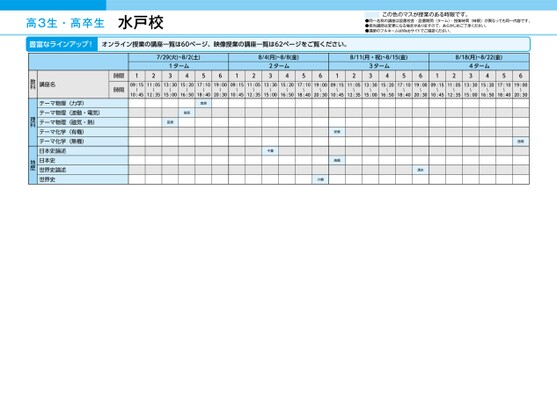 高3生・高卒生水戸校この色のマスが授業のある時限です。●同一名称の講座は設置校舎・設置期間(ターム)・授業時間(時限)が異なっても同一内容です。●担当講師は変更になる場合がありますので、あらかじめご了承ください。●講師のフルネームはWebサイトでご確認ください。豊富なラインアップ!オンライン授業の講座一覧は60ページ、映像授業の講座一覧は62ページをご覧ください。7/29(火)~8/2(土)1ターム341256128/4(月)~8/8(金)2ターム348/11(月・祝)~8/15(金)8/18(月)~8/22(金)56123ターム3456124ターム345609:1511:0513:3015:2017:1019:0009:1511:0513:3015:2017:1019:0009:1511:0513:3015:2017:1019:0009:1511:0513:3015:2017:1019:00〜〜〜〜〜〜〜〜〜〜〜〜〜10:4512:3515:0016:5018:4020:3010:4512:3515:0016:5018:4020:3010:4512:3515:0016:5018:4020:3010:4512:3515:0016:5018:4020:30〜〜〜〜〜〜〜〜〜〜〜宮原宮原宮原千葉安東髙橋小嶋西尾清水時限時間講座名テーマ物理(力学)テーマ物理(波動・電気)テーマ物理(磁気・熱)テーマ化学(有機)テーマ化学(無機)日本史論述日本史世界史論述世界史教科理科地歴●2025年度/夏期講習/東日本/水戸/高3・卒生/パターン34602025_56_3_344_11_20250328105233.csv/3ページ校了時削除
