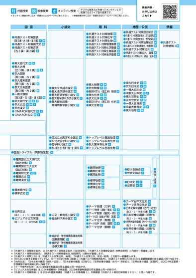 *「共通テスト対策歴史総合」は「共通テスト対策歴史総合,日本史探究」、「共通テスト対策歴史総合,世界史探究」と内容が一部重複します。*「共通テスト対策地理総合」、「共通テスト対策地理総合,地理探究」は教材が重複します。*「共通テスト対策公共」は「共通テスト対策公共,倫理」、「共通テスト対策公共,政治・経済」と内容が一部重複します。*「知らないと損する熟語イディオム」、「テーマ化学(有機)[基礎]」、「共通テスト対策歴史総合」、「共通テスト対策公共」は2024年度夏期講習の同名講座と同一内容です。*「古典文法」、「日本史集中講義(古代ー近世)」、「日本史集中講義(近現代)」、「世界史集中講義(古代ー18世紀)」、「世界史集中講義(近現代)」は2024年度夏期・冬期講習の同名講座と同一内容です。*「テーマ世界文化史」は2024年度冬期講習の同名講座と同一内容です。*「ビジュアル古文常識」は2024年度夏期・冬期講習、2025年度春期講習の同名講座と同一内容です。*「共通テスト対策情報Ⅰ」は2024年度夏期講習「共通テスト対策情報Ⅰ」、冬期講習「共通テスト傾向対策情報Ⅰテスト」と同一内容です。対対面授業映映像授業オオンライン授業デジタル端末などを使ってオンライン上で受講できるライブ型の授業です。*オンライン講座の申し込み・受講方法は60ページをご覧ください。*映像授業の申し込み・受講方法は61・62ページをご覧ください。講座内容・お申し込みはこちら▶国語小論文理科地歴・公民情報●共通テスト対策国語【現3講・古1講・漢1講】対映●共通テスト対策現代文映●共通テスト対策古典【古3講・漢2講】映●東大現代文対映●東大古典【古3講・漢2講】対映●京大国語【現3講・古2講】対●京大理系国語【現3講・古2講】映●京大文系国語【現3講・古2講】映●一橋大国語【現3講・古1講・漢1講】対●早大現代文対映オ●早大古文対映オ●早大漢文対●GMARCH現代文対オ●GMARCH古文対オ●共通テスト対策物理映●共通テスト対策化学映●共通テスト対策生物映●共通テスト対策物理基礎映●共通テスト対策化学基礎映●共通テスト対策生物基礎映●共通テスト対策地学基礎映●共通テスト対策歴史総合映●共通テスト対策歴史総合,日本史探究映●共通テスト対策歴史総合,世界史探究映●共通テスト対策地理総合映●共通テスト対策地理総合,地理探究映●共通テスト対策公共映●共通テスト対策公共,倫理映●共通テスト対策公共,政治・経済映●共通テスト対策情報Ⅰ映●慶大文学部小論文対●慶大法学部小論文対●慶大経済学部小論文対●慶大商学部B方式小論文対●慶大総合政策・環境情報学部小論文対●東大物理対映●京大物理対映●東京科学大(理工系)物理対●東大化学対映●京大化学対映●東京科学大(理工系)化学対●東大生物対●東大日本史対映●京大日本史対映●一橋大日本史対●早慶大日本史対オ●東大世界史対映●京大世界史対映●一橋大世界史対●早慶大世界史対オ●東大地理対映●政治・経済対●日本史論述対●世界史論述対●日本史対オ●世界史対オ●テーマ日本文化史対●テーマ世界文化史対●日本史集中講義(古代ー近世)(高2・3・卒生共通)対映●日本史集中講義(近現代)(高2・3・卒生共通)対●世界史集中講義(古代ー18世紀)(高2・3・卒生共通)対映●世界史集中講義(近現代)(高2・3・卒生共通)対●難関国公立大現代文(論述対策)対●難関国公立大古文(論述対策)対●難関現代文対オ●難関古文対●難関漢文対●標準現代文対●標準古文対●難関物理対●難関化学対●難関生物対●標準物理対●標準化学対●標準生物対●古典文法(高1・2・3・卒生共通)対●ビジュアル古文常識(高1・2・3・卒生共通)対映●人文・教育系小論文対●社会科学系小論文対●テーマ物理(力学)対●テーマ物理(波動・電気)対オ●テーマ物理(磁気・熱)対●テーマ化学(速度と平衡)[発展]対●テーマ化学(有機)対●テーマ化学(有機)[基礎]対オ●テーマ化学(無機)対●総合型・学校推薦型選抜対策(出願書類編)対●総合型・学校推薦型選抜対策(小論文編)対●医進トライアル〈英数物生型〉映●国公立大医学科小論文対●私立大医学科小論文対●医学科小論文対●医系小論文(医・看護・保健・歯・薬学系)対●トップレベル医進物理対●トップレベル医進化学対●私大薬学系化学対●トップレベル医進生物対