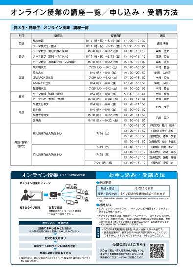 オンライン授業の講座一覧/申し込み・受講方法高3生・高卒生オンライン授業講座一覧科目英語数学国語理科地歴講座名私大英語テーマ英文法・語法テーマ数学(場合の数と確率)テーマ数学(数列・ベクトル)テーマ数学(複素数平面・2次曲線)早大現代文早大古文GMARCH現代文GMARCH古文難関現代文テーマ物理(波動・電気)テーマ化学(有機)[基礎]早慶大日本史日本史早慶大世界史世界史東大答案作成力強化トレ英語⁄数学⁄現代文京大答案作成力強化トレ授業日時8/11(月・祝)〜8/15(金)8/11(月・祝)〜8/15(金)8/18(月)〜8/22(金)8/11(月・祝)〜8/15(金)8/18(月)〜8/22(金)7/29(火)〜8/2(土)8/4(月)〜8/8(金)7/29(火)〜8/2(土)8/4(月)〜8/8(金)7/29(火)〜8/2(土)8/4(月)〜8/8(金)8/18(月)〜8/22(金)8/4(月)〜8/8(金)8/4(月)〜8/8(金)8/18(月)〜8/22(金)8/18(月)〜8/22(金)7/26(土)7/19(土)7/20(日)7/21(月・祝)11:00〜12:309:00〜10:3013:40〜15:1011:40〜13:1015:30〜17:0015:20〜16:5019:20〜20:5017:20〜18:5017:20〜18:5019:20〜20:509:00〜10:3011:00〜12:3013:20〜14:5015:20〜16:5013:20〜14:5015:20〜16:5011:00〜12:3013:20〜14:5015:20〜16:5015:20〜16:5013:40〜15:1013:40〜15:1013:40〜15:1013:40〜15:10講師成川博康森本啓夫佐野哲也森本啓夫木村哲也隼坂しのぶ木村哲也隼坂しのぶ木村哲也合田哲也若原周平竹内良元沼田英之(現代文)菊川智子(英語)田村喜宏(理類数学)香坂季京(文類数学)刈谷今比古(英語)刀禰泰史(理系数学)西浦高志(文系数学)藤野真也(現代文)中崎学オンライン授業(ライブ配信型授業)お申し込み・受講方法※ライブ配信を受講する場合は、ライブ配信の受講開始日の4日前までにお申し込みください。●視聴方法タブレットやスマートフォン、パソコンなどの機器とインターネット環境をご準備ください。オンライン授業当日は、視聴サイトへアクセスし、ログインしてお待ちください。視聴先のURL・見逃し配信の視聴方法などの詳細は、教材に同封される「オンライン授業の受講方法について」に記載があります。※見逃し配信は「終了した講単位」で視聴可能です。2025年度夏期講習同名講座(対面/映像)と同一内容です。授業担当講師に、授業当日やWeb質問書で質問いただくことはできません。あらかじめご了承のうえ、お申し込みください。注意事項変更・取りやめライブ配信の受講開始日の4日前まで●申込期間新規・追加8/21(木)まで受講の流れはこちら▶高3生「東大・京大答案作成力強化トレ」、高2生「答案作成力向上ラボ」については裏表紙の二次元コードからご確認ください。ILVE授業をライブ配信自宅で受講視聴端末とインターネット環境は、ご自身でご用意ください。お申し込み・受講方法講座のお申し込みとお支払い他の夏期講習の講座と同様にお申し込みください。教材のお受け取り専用サイトにログインし講義を視聴※見逃し配信で復習もできる※視聴方法は、教材に同封される「オンライン授業の受講方法について」をご確認ください。高3生・高卒生オンライン授業のイメージ●講師のフルネームはWebサイトでご確認ください。●担当講師は変更になる場合がありますので、あらかじめご了承ください。●同一名称の講座は設置校舎・設置期間(ターム)・授業時間(時限)が異なっても同一内容です。この色のマスが授業のある時限です。校了時削除2025_56_3_344_11_20250328105233.csv/3ページ●2025年度/夏期講習/東日本/水戸/高3・卒生/パターン3460