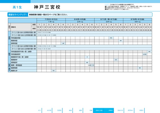 ●2025年度/夏期講習/近畿/京都/高1生/パターン35602025_56_5_531_31_20250324174335.csv/1ページ校了時削除この色のマスが授業のある時限です。●同一名称の講座は設置校舎・設置期間(ターム)・授業時間(時限)が異なっても同一内容です。●担当講師は変更になる場合がありますので、あらかじめご了承ください。●講師のフルネームはWebサイトでご確認ください。高1生神戸三宮校7/29(火)~8/2(土)1ターム431256128/4(月)~8/8(金)2ターム438/11(月・祝)~8/15(金)8/18(月)~8/22(金)56123ターム4356124ターム435609:3011:2013:4015:3017:2019:1009:3011:2013:4015:3017:2019:1009:3011:2013:4015:3017:2019:1009:3011:2013:4015:3017:2019:10〜〜〜〜〜〜〜〜〜〜〜〜〜11:0012:5015:1017:0018:5020:4011:0012:5015:1017:0018:5020:4011:0012:5015:1017:0018:5020:4011:0012:5015:1017:0018:5020:40〜〜〜〜〜〜〜〜〜〜〜8/9(土)17:20〜20:40清水8/14(木)〜8/15(金)15:30〜17:00西内山崎8/18(月)〜8/19(火)13:40〜15:10駒井8/16(土)17:20〜20:40岸岸湘田一番合戦・大村岡内清水西内松井駒井山本(敏)野村八木西大寺岸和田堺東高槻豊中神戸三宮校京都校天王寺校上本町校大阪校講座名時限時間【ダイジェスト】夏から始める入試対策英語(特別選抜・難関)【ダイジェスト】夏から始める入試対策英語(難関・標準)特別選抜英語難関英語標準英語【ダイジェスト】夏から始める入試対策数学(特別選抜・難関)【ダイジェスト】夏から始める入試対策数学(難関・標準)特別選抜数学中高一貫(速習)特別選抜数学難関数学中高一貫(速習)難関数学標準数学難関・標準国語難関物理難関化学教科英語数学国語理科豊富なラインアップ!映像授業の講座一覧は53ページをご覧ください。