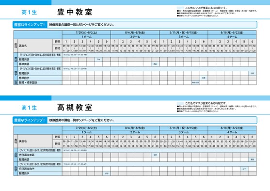 高1生豊中教室豊富なラインアップ!映像授業の講座一覧は53ページをご覧ください。この色のマスが授業のある時限です。●同一名称の講座は設置校舎・設置期間(ターム)・授業時間(時限)が異なっても同一内容です。●担当講師は変更になる場合がありますので、あらかじめご了承ください。●講師のフルネームはWebサイトでご確認ください。7/29(火)~8/2(土)1ターム431256128/4(月)~8/8(金)2ターム438/11(月・祝)~8/15(金)8/18(月)~8/22(金)56123ターム4356124ターム435609:3011:2013:4015:3018:0019:5009:3011:2013:4015:3018:0019:5009:3011:2013:4015:3018:0019:5009:3011:2013:4015:3018:0019:50〜〜〜〜〜〜〜〜〜〜〜〜〜〜〜〜〜〜〜〜〜〜〜〜11:0012:5015:1017:0019:3021:2011:0012:5015:1017:0019:3021:2011:0012:5015:1017:0019:3021:2011:0012:5015:1017:0019:3021:208/23(土)13:40〜17:00下村下村8/16(土)18:00〜21:20杉原西田講座名時限時間【ダイジェスト】夏から始める入試対策英語(難関・標準)難関英語標準英語【ダイジェスト】夏から始める入試対策数学(難関・標準)難関数学標準数学難関・標準国語教科英語数学国語吉田畑中・松村杉原この色のマスが授業のある時限です。●同一名称の講座は設置校舎・設置期間(ターム)・授業時間(時限)が異なっても同一内容です。●担当講師は変更になる場合がありますので、あらかじめご了承ください。●講師のフルネームはWebサイトでご確認ください。講座名時限時間7/29(火)~8/2(土)1ターム431256128/4(月)~8/8(金)2ターム438/11(月・祝)~8/15(金)8/18(月)~8/22(金)56123ターム4356124ターム435609:3011:2013:4015:3018:0019:5009:3011:2013:4015:3018:0019:5009:3011:2013:4015:3018:0019:5009:3011:2013:4015:3018:0019:50〜〜〜〜〜〜〜〜〜〜〜〜〜〜〜〜〜〜〜〜〜〜〜〜11:0012:5015:1017:0019:3021:2011:0012:5015:1017:0019:3021:2011:0012:5015:1017:0019:3021:2011:0012:5015:1017:0019:3021:20【ダイジェスト】夏から始める入試対策英語(特別選抜・難関)特別選抜英語難関英語【ダイジェスト】夏から始める入試対策数学(特別選抜・難関)特別選抜数学難関数学8/23(土)18:00〜21:20西田7/26(土)13:40〜17:00山下吉田松井西田山下教科英語数学高1生高槻教室豊富なラインアップ!映像授業の講座一覧は53ページをご覧ください。