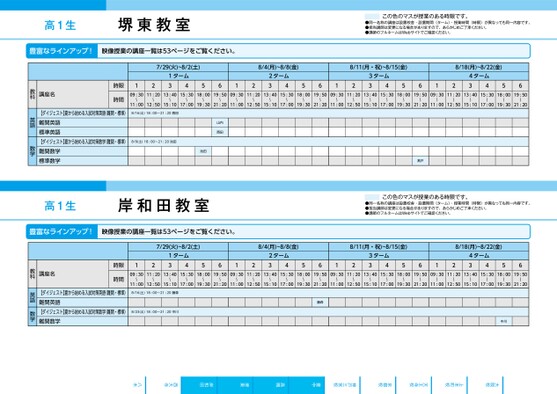 ●2025年度/夏期講習/近畿/豊中/高1生/パターン34602025_56_5_563_31_20250319130635.csv/1ページ校了時削除この色のマスが授業のある時限です。●同一名称の講座は設置校舎・設置期間(ターム)・授業時間(時限)が異なっても同一内容です。●担当講師は変更になる場合がありますので、あらかじめご了承ください。●講師のフルネームはWebサイトでご確認ください。高1生堺東教室講座名時限時間7/29(火)~8/2(土)1ターム431256128/4(月)~8/8(金)2ターム438/11(月・祝)~8/15(金)8/18(月)~8/22(金)56123ターム4356124ターム435609:3011:2013:4015:3018:0019:5009:3011:2013:4015:3018:0019:5009:3011:2013:4015:3018:0019:5009:3011:2013:4015:3018:0019:50〜〜〜〜〜〜〜〜〜〜〜〜〜〜〜〜〜〜〜〜〜〜〜〜11:0012:5015:1017:0019:3021:2011:0012:5015:1017:0019:3021:2011:0012:5015:1017:0019:3021:2011:0012:5015:1017:0019:3021:20【ダイジェスト】夏から始める入試対策英語(難関・標準)難関英語標準英語【ダイジェスト】夏から始める入試対策数学(難関・標準)難関数学標準数学8/16(土)18:00〜21:20西田8/9(土)18:00〜21:20池田山内西田池田髙戸教科英語数学豊富なラインアップ!映像授業の講座一覧は53ページをご覧ください。●2025年度/夏期講習/近畿/高槻教室/高1生/パターン3460高1生岸和田教室2025_56_5_540_31_20250319124958.csv/1ページこの色のマスが授業のある時限です。校了時削除●同一名称の講座は設置校舎・設置期間(ターム)・授業時間(時限)が異なっても同一内容です。●担当講師は変更になる場合がありますので、あらかじめご了承ください。●講師のフルネームはWebサイトでご確認ください。講座名時限時間7/29(火)~8/2(土)1ターム341256128/4(月)~8/8(金)2ターム348/11(月・祝)~8/15(金)8/18(月)~8/22(金)56123ターム3456124ターム345609:3011:2013:4015:3018:0019:5009:3011:2013:4015:3018:0019:5009:3011:2013:4015:3018:0019:5009:3011:2013:4015:3018:0019:50〜〜〜〜〜〜〜〜〜〜〜〜〜〜〜〜〜〜〜〜〜〜〜〜11:0012:5015:1017:0019:3021:2011:0012:5015:1017:0019:3021:2011:0012:5015:1017:0019:3021:2011:0012:5015:1017:0019:3021:20【ダイジェスト】夏から始める入試対策英語(難関・標準)難関英語【ダイジェスト】夏から始める入試対策数学(難関・標準)難関数学8/16(土)18:00〜21:20藤森8/23(土)18:00〜21:20中川藤森中川八木西大寺岸和田堺東高槻豊中神戸三宮校京都校天王寺校上本町校大阪校教科英語数学豊富なラインアップ!映像授業の講座一覧は53ページをご覧ください。