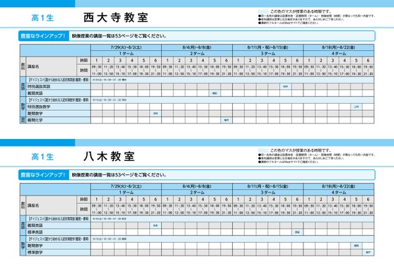 高1生西大寺教室豊富なラインアップ!映像授業の講座一覧は53ページをご覧ください。この色のマスが授業のある時限です。●同一名称の講座は設置校舎・設置期間(ターム)・授業時間(時限)が異なっても同一内容です。●担当講師は変更になる場合がありますので、あらかじめご了承ください。●講師のフルネームはWebサイトでご確認ください。7/29(火)~8/2(土)1ターム431256128/4(月)~8/8(金)2ターム438/11(月・祝)~8/15(金)8/18(月)~8/22(金)56123ターム4356124ターム435609:3011:2013:4015:3018:0019:5009:3011:2013:4015:3018:0019:5009:3011:2013:4015:3018:0019:5009:3011:2013:4015:3018:0019:50〜〜〜〜〜〜〜〜〜〜〜〜〜〜〜〜〜〜〜〜〜〜〜〜11:0012:5015:1017:0019:3021:2011:0012:5015:1017:0019:3021:2011:0012:5015:1017:0019:3021:2011:0012:5015:1017:0019:3021:208/23(土)18:00〜21:20増田8/16(土)18:00〜21:20河村河村増田福井松井上村講座名時限時間【ダイジェスト】夏から始める入試対策英語(難関・標準)特別選抜英語難関英語【ダイジェスト】夏から始める入試対策数学(難関・標準)特別選抜数学難関数学難関化学教科英語数学理科高1生八木教室豊富なラインアップ!映像授業の講座一覧は53ページをご覧ください。この色のマスが授業のある時限です。●同一名称の講座は設置校舎・設置期間(ターム)・授業時間(時限)が異なっても同一内容です。●担当講師は変更になる場合がありますので、あらかじめご了承ください。●講師のフルネームはWebサイトでご確認ください。7/29(火)~8/2(土)1ターム431256128/4(月)~8/8(金)2ターム438/11(月・祝)~8/15(金)8/18(月)~8/22(金)56123ターム4356124ターム435609:3011:2013:4015:3018:0019:5009:3011:2013:4015:3018:0019:5009:3011:2013:4015:3018:0019:5009:3011:2013:4015:3018:0019:50〜〜〜〜〜〜〜〜〜〜〜〜〜〜〜〜〜〜〜〜〜〜〜〜11:0012:5015:1017:0019:3021:2011:0012:5015:1017:0019:3021:2011:0012:5015:1017:0019:3021:2011:0012:5015:1017:0019:3021:208/23(土)18:00〜21:20松本松本8/16(土)18:00〜21:20信岡西田信岡髙戸講座名時限時間【ダイジェスト】夏から始める入試対策英語(難関・標準)難関英語標準英語【ダイジェスト】夏から始める入試対策数学(難関・標準)難関数学標準数学教科英語数学