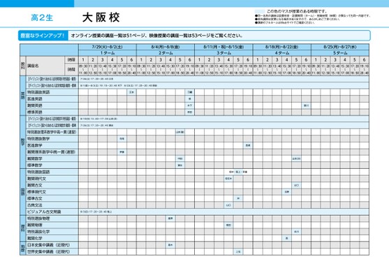 高2生大阪校この色のマスが授業のある時限です。●同一名称の講座は設置校舎・設置期間(ターム)・授業時間(時限)が異なっても同一内容です。●担当講師は変更になる場合がありますので、あらかじめご了承ください。●講師のフルネームはWebサイトでご確認ください。豊富なラインアップ!オンライン授業の講座一覧は51ページ、映像授業の講座一覧は53ページをご覧ください。7/29(火)~8/2(土)8/4(月)~8/8(金)8/11(月・祝)~8/15(金)8/18(月)~8/22(金)8/25(月)~8/27(水)ムータ1431256109:3011:2013:4015:3017:2019:1009:302311:20ムータ245612ムータ3435612ムータ44356113:4015:3017:2019:1009:3011:2013:4015:3017:2019:1009:3011:2013:4015:3017:2019:1009:30ムータ5413:4015:302311:205617:2019:1011:0012:5015:1017:0018:5020:4011:0012:5015:1017:0018:5020:4011:0012:5015:1017:0018:5020:4011:0012:5015:1017:0018:5020:4011:0012:5015:1017:0018:5020:407/26(土)17:20〜20:40江本8/1(金)〜8/2(土)19:10〜20:40木下8/23(土)17:20〜20:40原田8/10(日)13:40〜17:00山本(洋)7/26(土)17:20〜20:40瀬古寺尾伊藤8/3(日)17:20〜20:40阪上慎木下原田山本(敏)中田瀬古瀧澤高木香川山本(洋)山口北野古川西西浦畑中・阪上・幸重佐佐木山口植田仲上住時限時間講座名教科【ダイジェスト】夏から始める入試対策英語(特別選抜・難関)【ダイジェスト】夏から始める入試対策英語(難関・標準)特別選抜英語医進英語難関英語標準英語【ダイジェスト】夏から始める入試対策数学(特別選抜・難関)【ダイジェスト】夏から始める入試対策数学(難関・標準)特別選抜理系数学中高一貫(速習)特別選抜数学医進数学難関理系数学中高一貫(速習)難関数学標準数学特別選抜国語難関現代文難関古文標準現代文標準古文古典文法ビジュアル古文常識特別選抜物理難関物理特別選抜化学難関化学日本史集中講義(近現代)世界史集中講義(近現代)英語数学国語理科地歴