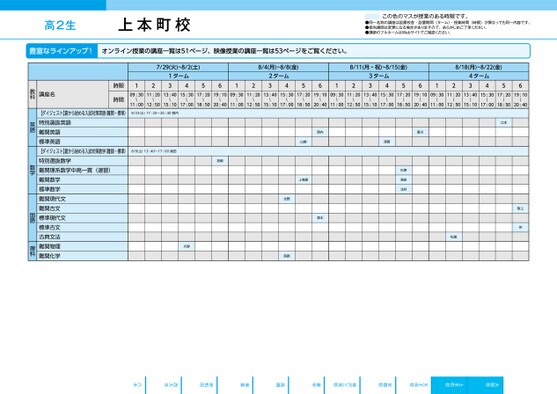 ●2025年度/夏期講習/近畿/大阪/高2生/パターン35602025_56_5_511_32_20250324174335.csv/1ページ校了時削除この色のマスが授業のある時限です。●同一名称の講座は設置校舎・設置期間(ターム)・授業時間(時限)が異なっても同一内容です。●担当講師は変更になる場合がありますので、あらかじめご了承ください。●講師のフルネームはWebサイトでご確認ください。高2生上本町校7/29(火)~8/2(土)1ターム431256128/4(月)~8/8(金)2ターム438/11(月・祝)~8/15(金)8/18(月)~8/22(金)56123ターム4356124ターム435609:3011:2013:4015:3017:2019:1009:3011:2013:4015:3017:2019:1009:3011:2013:4015:3017:2019:1009:3011:2013:4015:3017:2019:10〜〜〜〜〜〜〜〜〜〜〜〜〜11:0012:5015:1017:0018:5020:4011:0012:5015:1017:0018:5020:4011:0012:5015:1017:0018:5020:4011:0012:5015:1017:0018:5020:40〜〜〜〜〜〜〜〜〜〜〜8/23(土)17:20〜20:40西内8/9(土)13:40〜17:00湘田宮崎大學西内山崎香川津留江本上高原青木北野宮路杉原湘田北村阪上仲松尾八木西大寺岸和田堺東高槻豊中神戸三宮校京都校天王寺校上本町校大阪校講座名時限時間【ダイジェスト】夏から始める入試対策英語(難関・標準)特別選抜英語難関英語標準英語【ダイジェスト】夏から始める入試対策数学(難関・標準)特別選抜数学難関理系数学中高一貫(速習)難関数学標準数学難関現代文難関古文標準現代文標準古文古典文法難関物理難関化学教科英語数学国語理科豊富なラインアップ!オンライン授業の講座一覧は51ページ、映像授業の講座一覧は53ページをご覧ください。