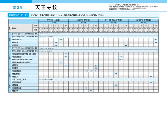 高2生天王寺校この色のマスが授業のある時限です。●同一名称の講座は設置校舎・設置期間(ターム)・授業時間(時限)が異なっても同一内容です。●担当講師は変更になる場合がありますので、あらかじめご了承ください。●講師のフルネームはWebサイトでご確認ください。豊富なラインアップ!オンライン授業の講座一覧は51ページ、映像授業の講座一覧は53ページをご覧ください。7/29(火)~8/2(土)ムータ143125612(4/8月)~8/8(金)ムータ2438/11(月・祝)~8/15(金)8/18(月)~8/22(金)5612ムータ3435612ムータ4435617:2019:1009:3011:2013:4015:3017:2019:1009:3011:2013:4015:3017:2019:1009:3011:2013:4015:3017:2019:1009:3011:2013:4015:3011:0012:5015:1017:0018:5020:4011:0012:5015:1017:0018:5020:4011:0012:5015:1017:0018:5020:4011:0012:5015:1017:0018:5020:408/21(木)〜8/22(金)15:30〜17:00胡摩﨑8/9(土)17:20〜20:40国松胡摩﨑胡摩﨑山崎7/26(土)17:20〜20:40湘田8/3(日)17:20〜20:40岸湘田中田岸岸8/9(土)13:40〜17:00阪上津留上高原山本(洋)江濵辻居村北信岡佐佐木・山本(ま)・畑小松岡内原田国松菅井吉田講座名時限時間【ダイジェスト】夏から始める入試対策英語(特別選抜・難関)【ダイジェスト】夏から始める入試対策英語(難関・標準)特別選抜英語難関英語標準英語【ダイジェスト】夏から始める入試対策数学(特別選抜・難関)【ダイジェスト】夏から始める入試対策数学(難関・標準)特別選抜理系数学中高一貫(速習)特別選抜数学難関理系数学中高一貫(速習)難関数学中高一貫(速習)難関数学標準数学特別選抜国語難関現代文難関古文ビジュアル古文常識特別選抜物理難関物理特別選抜化学難関化学教科英語数学国語理科