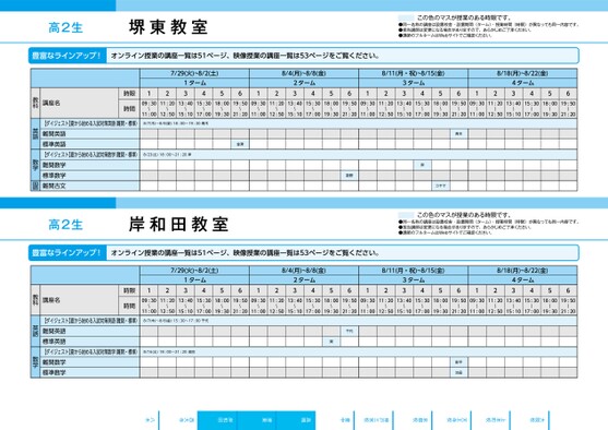 ●2025年度/夏期講習/近畿/高槻教室/高2生/パターン34602025_56_5_540_32_20250319131746.csv/1ページ校了時削除この色のマスが授業のある時限です。●同一名称の講座は設置校舎・設置期間(ターム)・授業時間(時限)が異なっても同一内容です。●担当講師は変更になる場合がありますので、あらかじめご了承ください。●講師のフルネームはWebサイトでご確認ください。高2生堺東教室7/29(火)~8/2(土)1ターム431256128/4(月)~8/8(金)2ターム438/11(月・祝)~8/15(金)8/18(月)~8/22(金)56123ターム4356124ターム435609:3011:2013:4015:3018:0019:5009:3011:2013:4015:3018:0019:5009:3011:2013:4015:3018:0019:5009:3011:2013:4015:3018:0019:50〜〜〜〜〜〜〜〜〜〜〜〜〜〜〜〜〜〜〜〜〜〜〜〜11:0012:5015:1017:0019:3021:2011:0012:5015:1017:0019:3021:2011:0012:5015:1017:0019:3021:2011:0012:5015:1017:0019:3021:208/7(木)〜8/8(金)18:00〜19:30青木8/23(土)18:00〜21:20岸金澤青木岸コヤマ数野講座名時限時間【ダイジェスト】夏から始める入試対策英語(難関・標準)難関英語標準英語【ダイジェスト】夏から始める入試対策数学(難関・標準)難関数学標準数学難関古文教科英語数学国語豊富なラインアップ!オンライン授業の講座一覧は51ページ、映像授業の講座一覧は53ページをご覧ください。高2生岸和田教室この色のマスが授業のある時限です。●同一名称の講座は設置校舎・設置期間(ターム)・授業時間(時限)が異なっても同一内容です。●担当講師は変更になる場合がありますので、あらかじめご了承ください。●講師のフルネームはWebサイトでご確認ください。豊富なラインアップ!オンライン授業の講座一覧は51ページ、映像授業の講座一覧は53ページをご覧ください。7/29(火)~8/2(土)1ターム341256128/4(月)~8/8(金)2ターム348/11(月・祝)~8/15(金)8/18(月)~8/22(金)56123ターム3456124ターム345609:3011:2013:4015:3018:0019:5009:3011:2013:4015:3018:0019:5009:3011:2013:4015:3018:0019:5009:3011:2013:4015:3018:0019:50〜〜〜〜〜〜〜〜〜〜〜〜〜〜〜〜〜〜〜〜〜〜〜〜11:0012:5015:1017:0019:3021:2011:0012:5015:1017:0019:3021:2011:0012:5015:1017:0019:3021:2011:0012:5015:1017:0019:3021:208/7(木)〜8/8(金)15:30〜17:00千代8/16(土)18:00〜21:20池田千代巽影平池田八木西大寺岸和田堺東高槻豊中神戸三宮校京都校天王寺校上本町校大阪校講座名時限時間【ダイジェスト】夏から始める入試対策英語(難関・標準)難関英語標準英語【ダイジェスト】夏から始める入試対策数学(難関・標準)難関数学標準数学教科英語数学
