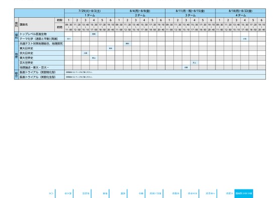 7/29(火)~8/2(土)ムータ134125612(4/8月)~8/8(金)ムータ23456125612ムータ334この色のマスが授業のある時限です。8/11(月・祝)~8/15(金)●同一名称の講座は設置校舎・設置期間(ターム)・授業時間(時限)が異なっても同一内容です。●担当講師は変更になる場合がありますので、あらかじめご了承ください。●講師のフルネームはWebサイトでご確認ください。8/18(月)~8/22(金)ムータ4345617:2019:1009:3011:2013:4015:3017:2019:1009:3011:2013:4015:3017:2019:1009:3011:2013:4015:3017:2019:1009:3011:2013:4015:3011:0012:5015:1017:0018:5020:4011:0012:5015:1017:0018:5020:4011:0012:5015:1017:0018:5020:4011:0012:5015:1017:0018:5020:40高松宮本西尾古川小倉影山時間割は52ページをご覧ください。時間割は52ページをご覧ください。小松井上河野講座名時限時間トップレベル医進生物テーマ化学(速度と平衡)[発展]共通テスト対策地理総合,地理探究東大日本史京大日本史東大世界史京大世界史地理論述-東大・京大-医進トライアル(英数物化型)医進トライアル(英数化生型)教科理科地歴総合高3生・高卒生●2025年度/夏期講習/近畿/東京医/高3・卒生/パターン34602025_56_5_512_11_20250324191244.csv/1ページ校了時削除●2025年度/夏期講習/近畿/東京医/高3・卒生/パターン34602025_56_5_512_11_20250324191244.csv/2ページ校了時削除八木西大寺岸和田堺東高槻豊中神戸三宮校京都校天王寺校上本町校大阪校東大・京大・医進館
