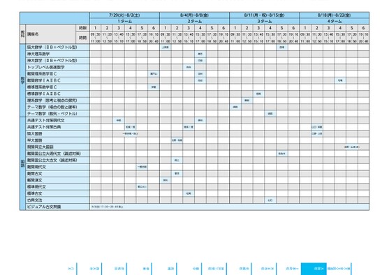 7/29(火)~8/2(土)1ターム341256128/4(月)~8/8(金)2ターム3456125612563ターム34この色のマスが授業のある時限です。8/11(月・祝)~8/15(金)●同一名称の講座は設置校舎・設置期間(ターム)・授業時間(時限)が異なっても同一内容です。●担当講師は変更になる場合がありますので、あらかじめご了承ください。●講師のフルネームはWebサイトでご確認ください。8/18(月)~8/22(金)4ターム3409:3011:2013:4015:3017:2019:1009:3011:2013:4015:3017:2019:1009:3011:2013:4015:3017:2019:1009:3011:2013:4015:3017:2019:10〜〜〜〜〜〜〜〜〜〜〜〜〜〜〜〜〜〜〜〜〜〜〜〜11:0012:5015:1017:0018:5020:4011:0012:5015:1017:0018:5020:4011:0012:5015:1017:0018:5020:4011:0012:5015:1017:0018:5020:40上高原西浦池谷瀬古中田北村池谷奥村菅井・畑瀬戸山伊藤中崎松尾・畑一番合戦・阪上北野・松尾阪上菅井永松松尾一番合戦野口(た)8/3(日)17:20〜20:40阪上寺尾信岡藤田信岡山口・幸重江濵・上田佐佐木北野・山本(ま)信岡山口時限時間高3生・高卒生講座名教科阪大数学(ⅡB+ベクトル型)神大理系数学神大数学(ⅡB+ベクトル型)トップレベル医進数学難関理系数学ⅢC難関数学ⅠAⅡBC標準理系数学ⅢC標準数学ⅠAⅡBC理系数学(思考と視点の探究)テーマ数学(場合の数と確率)テーマ数学(数列・ベクトル)共通テスト対策現代文共通テスト対策古典阪大国語早大国語関関同立大国語難関国公立大現代文(論述対策)難関国公立大古文(論述対策)難関現代文難関古文難関漢文標準現代文標準古文古典文法ビジュアル古文常識数学国語●2025年度/夏期講習/近畿/大阪/高3・卒生/パターン34602025_56_5_511_11_20250324191244.csv/1ページ校了時削除●2025年度/夏期講習/近畿/大阪/高3・卒生/パターン34602025_56_5_511_11_20250324191244.csv/2ページ校了時削除八木西大寺岸和田堺東高槻豊中神戸三宮校京都校天王寺校上本町校大阪校東大・京大・医進館