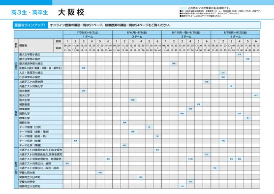 高3生・高卒生大阪校この色のマスが授業のある時限です。●同一名称の講座は設置校舎・設置期間(ターム)・授業時間(時限)が異なっても同一内容です。●担当講師は変更になる場合がありますので、あらかじめご了承ください。●講師のフルネームはWebサイトでご確認ください。豊富なラインアップ!オンライン授業の講座一覧は51ページ、映像授業の講座一覧は54ページをご覧ください。7/29(火)~8/2(土)ムータ134125612(4/8月)~8/8(金)ムータ2348/11(月・祝)~8/15(金)8/18(月)~8/22(金)5612ムータ3345612ムータ4345617:2019:1009:3011:2013:4015:3017:2019:1009:3011:2013:4015:3017:2019:1009:3011:2013:4015:3017:2019:1009:3011:2013:4015:3011:0012:5015:1017:0018:5020:4011:0012:5015:1017:0018:5020:4011:0012:5015:1017:0018:5020:4011:0012:5015:1017:0018:5020:40加賀吉田本瀬河合高松小倉山本神坂古川古川西山本神坂西小松神坂吉田大學岡内吉田井上西尾瀧澤西尾岡内乾乾宮本居土中松高松高河合宮本上住上住時限時間講座名教科慶大文学部小論文慶大法学部小論文慶大経済学部小論文医療系小論文(看護・保健・歯・薬学系)人文・教育系小論文社会科学系小論文共通テスト対策物理共通テスト対策化学阪大物理阪大化学阪大生物難関物理標準物理難関化学標準化学難関生物テーマ物理(力学)テーマ物理(波動・電気)テーマ物理(磁気・熱)テーマ化学(有機)テーマ化学(無機)共通テスト対策歴史総合,日本史探究共通テスト対策歴史総合,世界史探究共通テスト対策地理総合,地理探究共通テスト対策公共,倫理共通テスト対策公共,政治・経済早慶大日本史関関同立大日本史早慶大世界史関関同立大世界史小論文理科地歴・公民●2025年度/夏期講習/近畿/大阪/高3・卒生/パターン34602025_56_5_511_11_20250324191244.csv/3ページ校了時削除