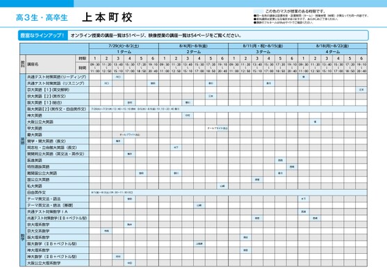 高3生・高卒生上本町校この色のマスが授業のある時限です。●同一名称の講座は設置校舎・設置期間(ターム)・授業時間(時限)が異なっても同一内容です。●担当講師は変更になる場合がありますので、あらかじめご了承ください。●講師のフルネームはWebサイトでご確認ください。豊富なラインアップ!オンライン授業の講座一覧は51ページ、映像授業の講座一覧は54ページをご覧ください。7/29(火)~8/2(土)ムータ134125612(4/8月)~8/8(金)ムータ2348/11(月・祝)~8/15(金)8/18(月)~8/22(金)5612ムータ3345612ムータ4345617:2019:1009:3011:2013:4015:3017:2019:1009:3011:2013:4015:3017:2019:1009:3011:2013:4015:3017:2019:1009:3011:2013:4015:3011:0012:5015:1017:0018:5020:4011:0012:5015:1017:0018:5020:4011:0012:5015:1017:0018:5020:4011:0012:5015:1017:0018:5020:40川口口川前堂/6(水)〜8/8(金)19:10〜20:40香川中村オールブライト法山横井横井前堂木下川香8/1(金)〜8/2(土)09:30〜11:00川口寺尾堂前駒井河村中田川香江本オールブライト法山山崎山崎上高原津留田湘涌谷湘田慎川香江本西岡香川西岡慎木下西浦浦西時限時間講座名教科共通テスト対策英語(リーディング)共通テスト対策英語(リスニング)京大英語【1】英文解釈)京大英語【2】英作文)阪大英語【1】総合)阪大英語【2】英作文・自由英作文)神大英語大阪公立大英語早大英語慶大英語関学・関大英語(長文)同志社・立命館大英語(長文)関関同立大英語(英文法・英作文)医進英語特別選抜英語難関国公立大英語国公立大英語私大英語自由英作文テーマ英文法・語法テーマ英文法・語法[基礎]共通テスト対策数学IA共通テスト対策数学(ⅡB+ベクトル型)京大理系数学京大文系数学阪大理系数学阪大数学(ⅡB+ベクトル型)神大理系数学神大数学(ⅡB+ベクトル型)大阪公立大理系数学英語数学●2025年度/夏期講習/近畿/上本町/高3・卒生/パターン34602025_56_5_513_11_20250319154534.csv/1ページ校了時削除