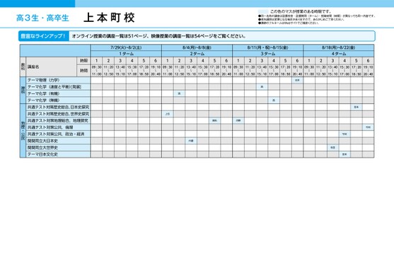 高3生・高卒生上本町校この色のマスが授業のある時限です。●同一名称の講座は設置校舎・設置期間(ターム)・授業時間(時限)が異なっても同一内容です。●担当講師は変更になる場合がありますので、あらかじめご了承ください。●講師のフルネームはWebサイトでご確認ください。豊富なラインアップ!オンライン授業の講座一覧は51ページ、映像授業の講座一覧は54ページをご覧ください。7/29(火)~8/2(土)1ターム431256128/4(月)~8/8(金)2ターム438/11(月・祝)~8/15(金)8/18(月)~8/22(金)56123ターム4356124ターム435609:3011:2013:4015:3017:2019:1009:3011:2013:4015:3017:2019:1009:3011:2013:4015:3017:2019:1009:3011:2013:4015:3017:2019:10〜〜〜〜〜〜〜〜〜〜〜〜〜11:0012:5015:1017:0018:5020:4011:0012:5015:1017:0018:5020:4011:0012:5015:1017:0018:5020:4011:0012:5015:1017:0018:5020:40〜〜〜〜〜〜〜〜〜〜〜池本西西西上住内藤高松河野宮本竹村竹村宮本寺田講座名時限時間テーマ物理(力学)テーマ化学(速度と平衡)[発展]テーマ化学(有機)テーマ化学(無機)共通テスト対策歴史総合,日本史探究共通テスト対策歴史総合,世界史探究共通テスト対策地理総合,地理探究共通テスト対策公共,倫理共通テスト対策公共,政治・経済関関同立大日本史関関同立大世界史テーマ日本文化史教科理科地歴・公民