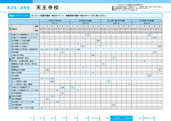 ●2025年度/夏期講習/近畿/上本町/高3・卒生/パターン34602025_56_5_513_11_20250319154534.csv/3ページ高3生・高卒生天王寺校校了時削除この色のマスが授業のある時限です。●同一名称の講座は設置校舎・設置期間(ターム)・授業時間(時限)が異なっても同一内容です。●担当講師は変更になる場合がありますので、あらかじめご了承ください。●講師のフルネームはWebサイトでご確認ください。7/29(火)~8/2(土)ムータ143125612(4/8月)~8/8(金)ムータ2438/11(月・祝)~8/15(金)8/18(月)~8/22(金)5612ムータ3435612ムータ44309:3011:2013:4015:3017:2019:1009:3011:2013:4015:3017:2019:1009:3011:2013:4015:3017:2019:1009:3011:2013:4015:305617:2019:1011:0012:5015:1017:0018:5020:4011:0012:5015:1017:0018:5020:4011:0012:5015:1017:0018:5020:4011:0012:5015:1017:0018:5020:40江本8/4(月)〜8/6(水)11:20〜12:50横井8/18(月)〜8/20(水)15:30〜17:00胡摩﨑木多胡摩﨑8/9(土)17:20〜20:40堂前胡摩﨑上高原山下浦西西浦下山上高原影平上高原影平堂前横井江本堂前胡摩﨑慎慎胡摩﨑戸谷西内胡摩﨑胡摩﨑国松津留西内藤森慎戸谷山本(洋)時限時間講座名教科共通テスト対策英語(リーディング)共通テスト対策英語(リスニング)京大英語【1】英文解釈)京大英語【2】英作文)阪大英語【1】総合)阪大英語【2】英作文・自由英作文)神大英語大阪公立大英語関学・関大英語(長文)同志社・立命館大英語(長文)関関同立大英語(英文法・英作文)医進英語難関国公立大英語国公立大英語私大英語自由英作文テーマ英文法・語法テーマ英文法・語法[基礎]共通テスト対策数学IA共通テスト対策数学(ⅡB+ベクトル型)京大理系数学京大文系数学阪大理系数学阪大数学(ⅡB+ベクトル型)神大理系数学神大数学(ⅡB+ベクトル型)英語数学豊富なラインアップ!オンライン授業の講座一覧は51ページ、映像授業の講座一覧は54ページをご覧ください。八木西大寺岸和田堺東高槻豊中神戸三宮校京都校天王寺校上本町校大阪校東大・京大・医進館